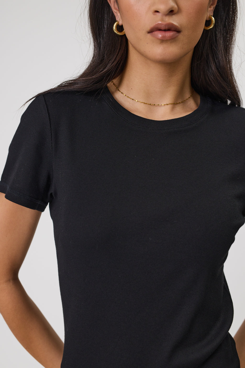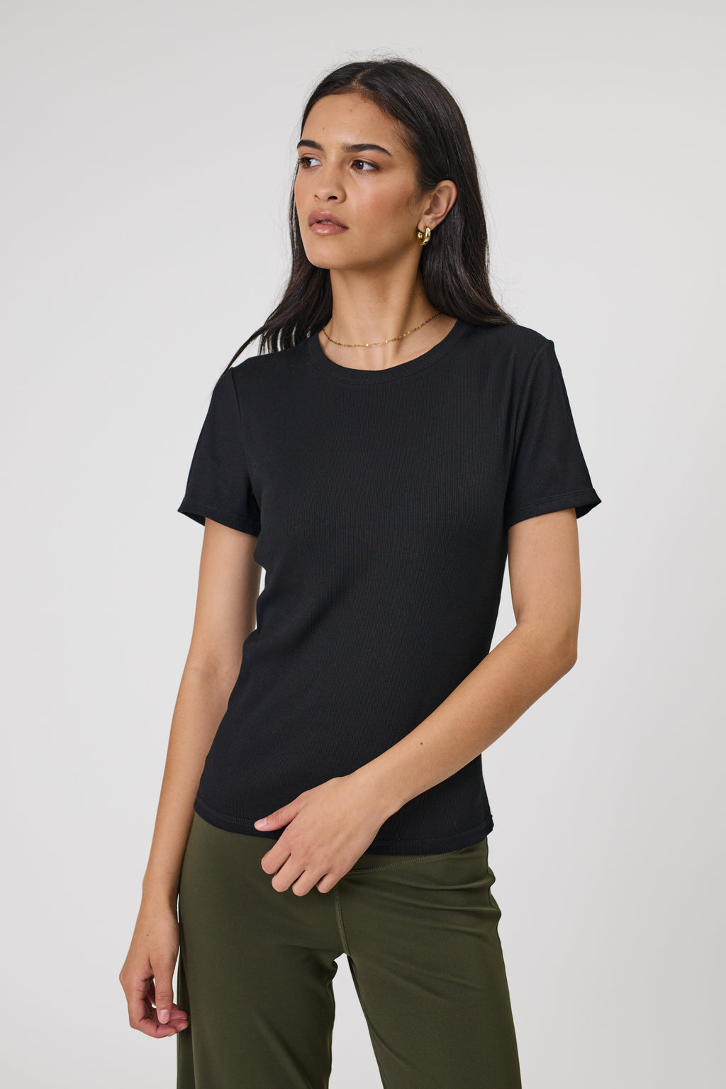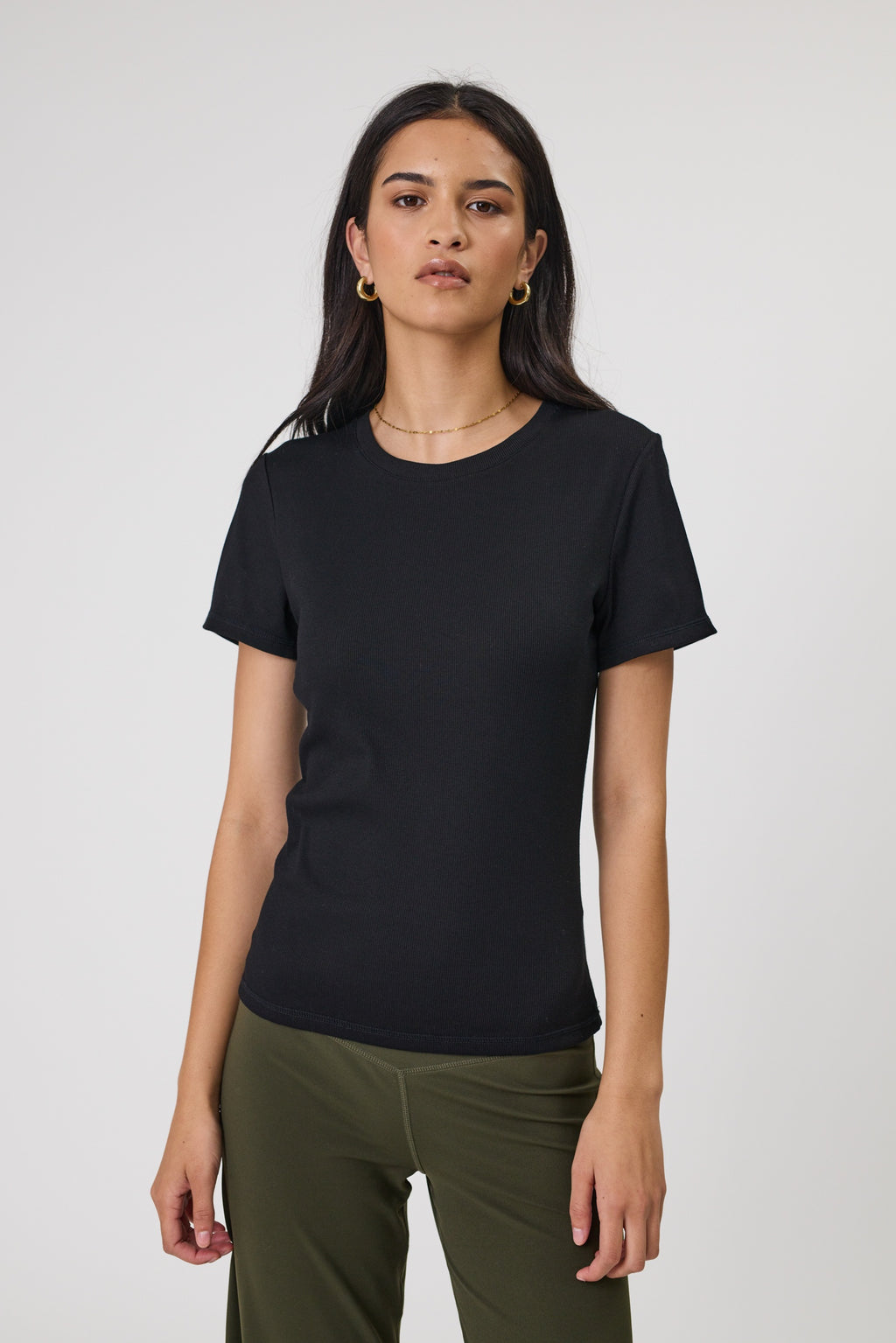 The Echo Rib Tee is a timeless staple designed for easy dressing. Crafted from soft, stretchy cotton blend with fine rib detailing, this slim-fit tee features a classic crew neckline and short sleeves for a clean, versatile look. Comfortable, flattering, and easy to style, it’s perfect on its own or layered under your favourite jackets and knits.