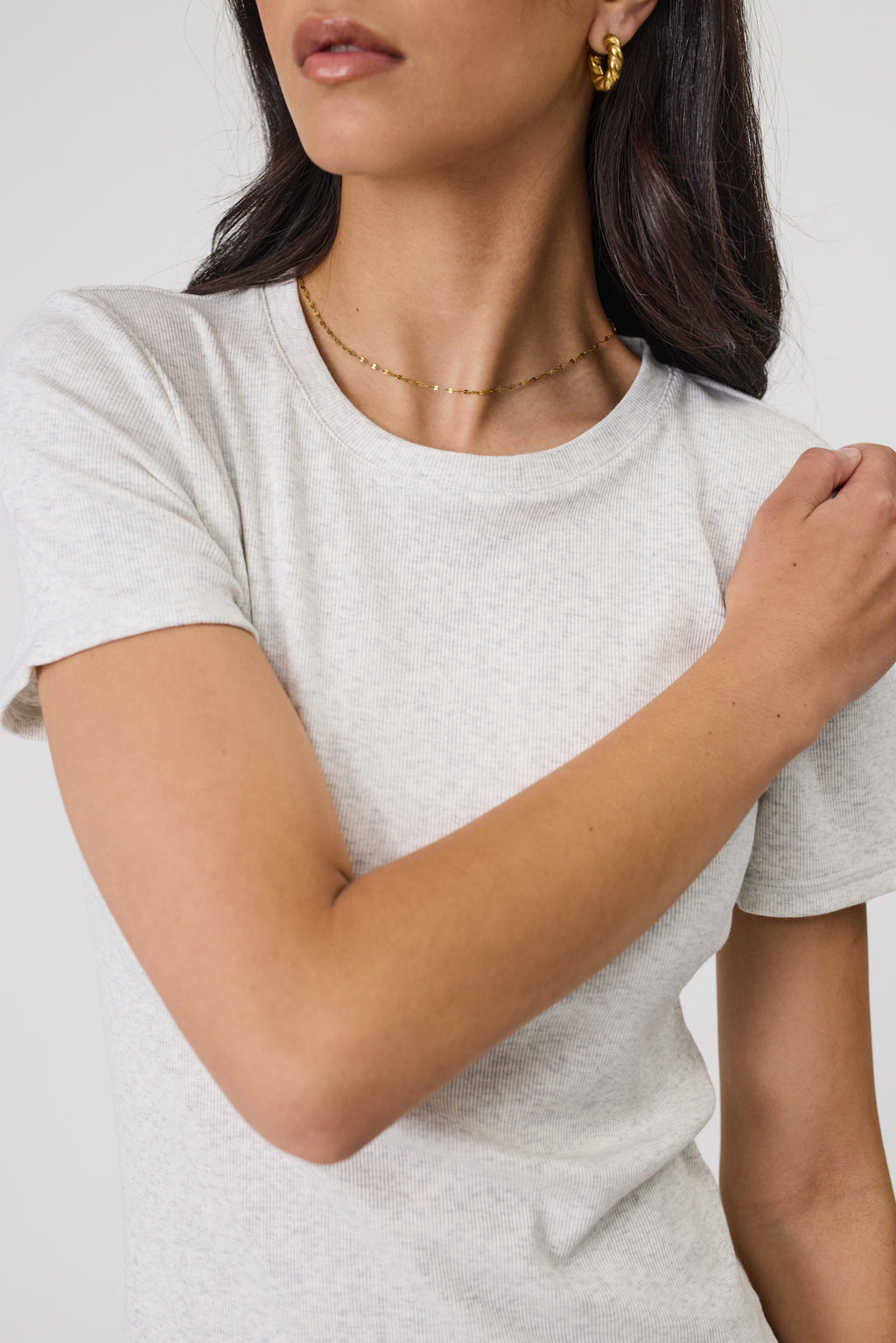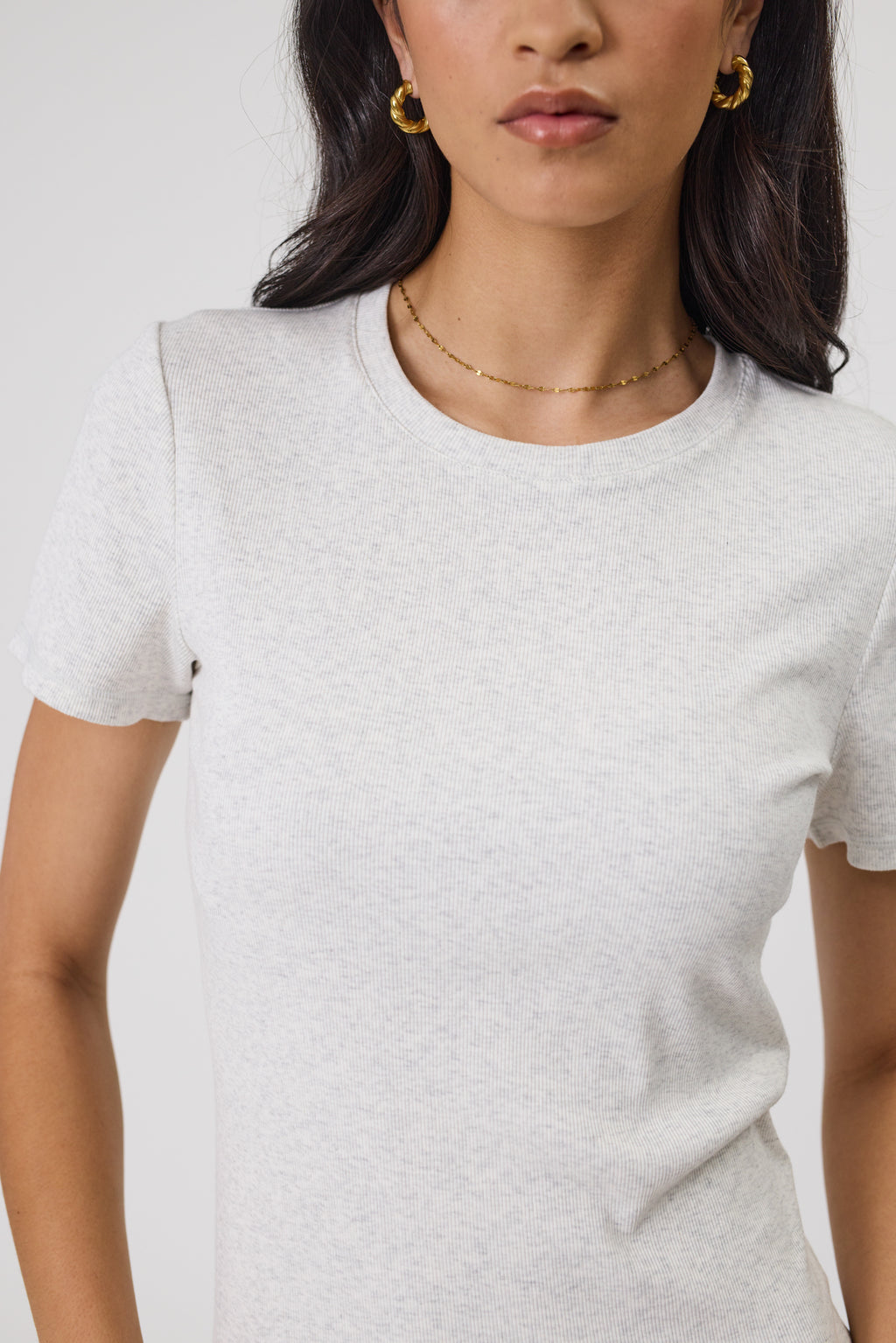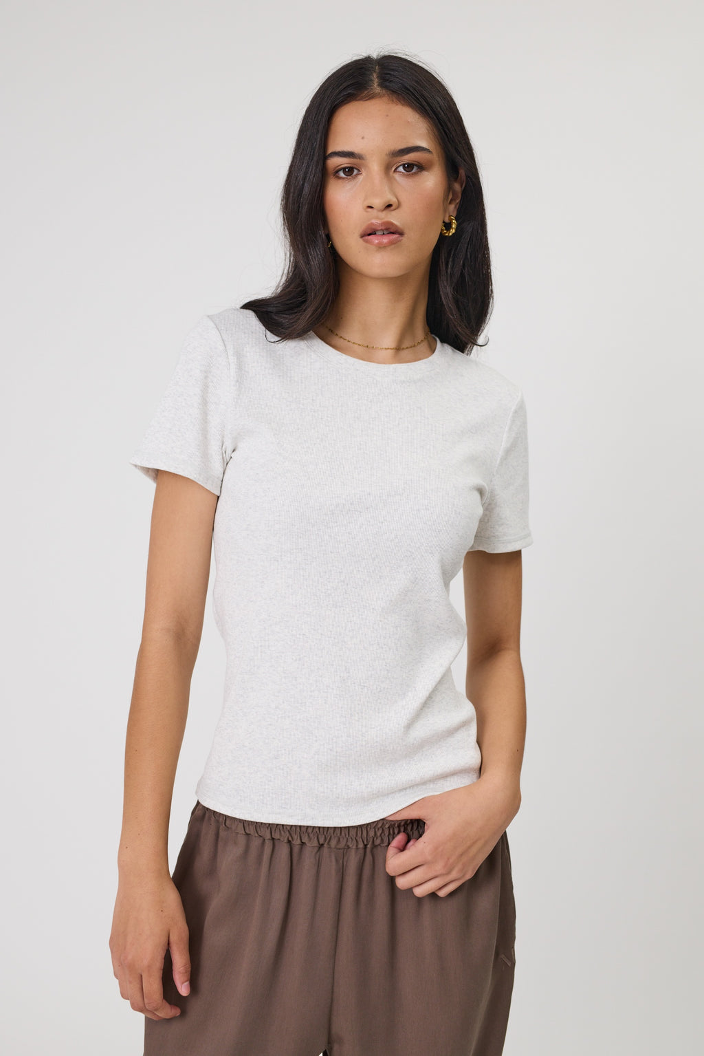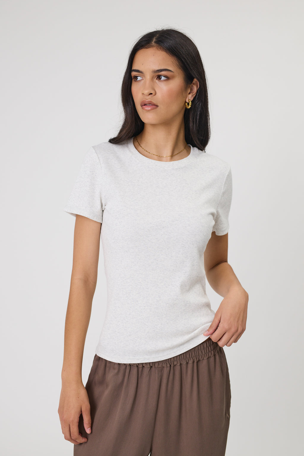The Echo Rib Tee is a timeless staple designed for easy dressing. Crafted from soft, stretchy cotton blend with fine rib detailing, this slim-fit tee features a classic crew neckline and short sleeves for a clean, versatile look. Comfortable, flattering, and easy to style, its perfect on its own or layered under your favourite jackets and knits.