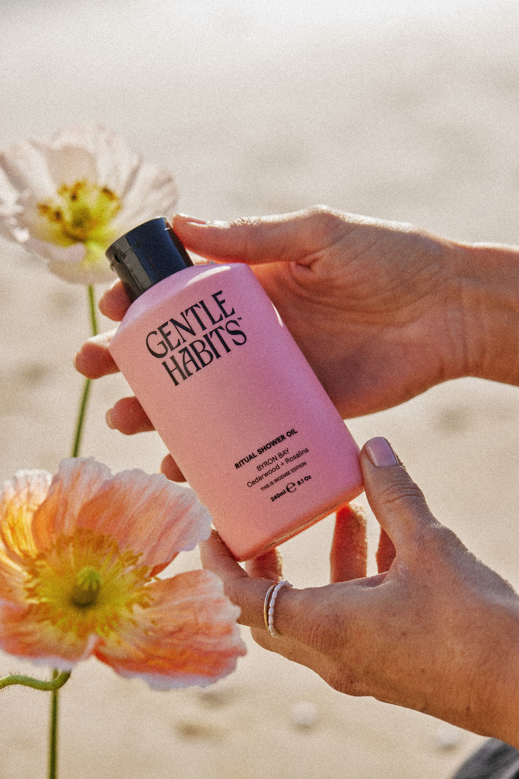 Gentle Habits deeply hydrating Ritual Shower Oil harnesses the skin-replenishing power of Rosehip, Vitamin E, Lanolin, and blended essential oils to nourish and protect the skin while vividly awakening the senses.