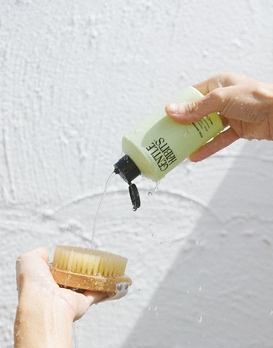Morning or evening, bath or shower, gently massage a small amount all over your body after you have finished washing and or use as a body cleanser. For an elevated experience, start or follow with the application of a shower brush to the skin in gentle, circular motions, starting at your ankles and finishing towards your heart.