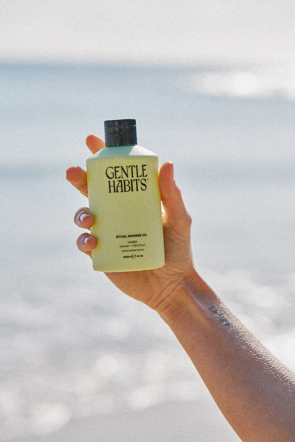 Gentle Habits deeply hydrating Ritual Shower Oil harnesses the skin-replenishing power of Rosehip, Vitamin E, Lanolin, and blended essential oils to nourish and protect the skin while vividly awakening the senses.