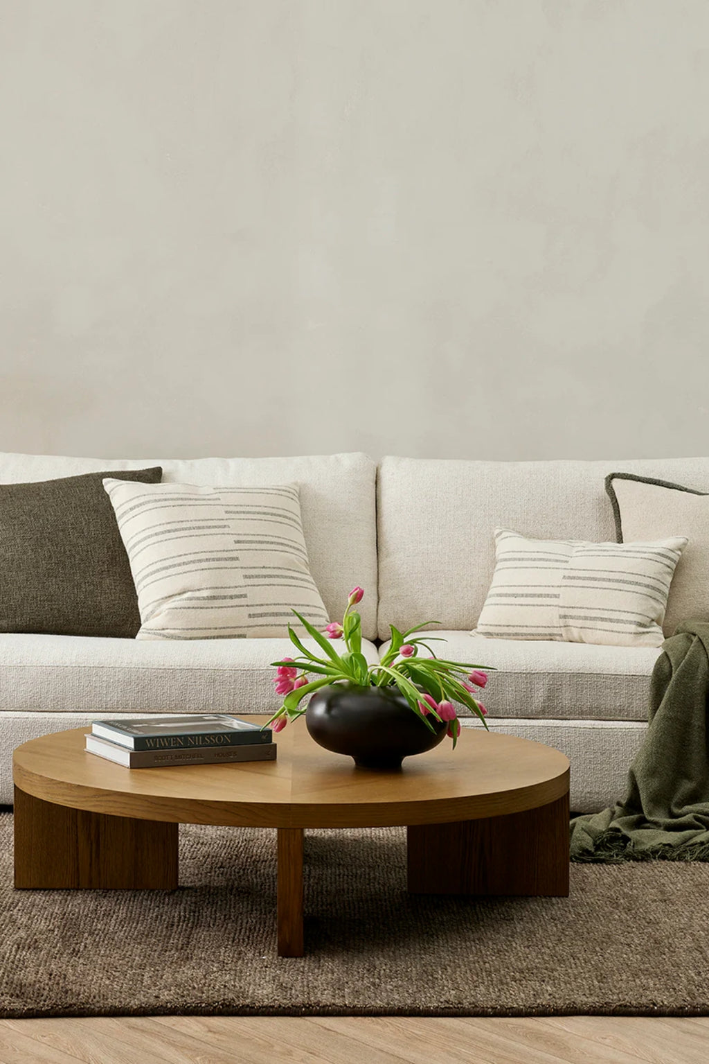 A study in balance, the Abbott cushion features asymmetrical linework in sage, woven into a natural ecru base. Crafted from a soft cotton blend, the generous size offers both comfort and refined simplicity.