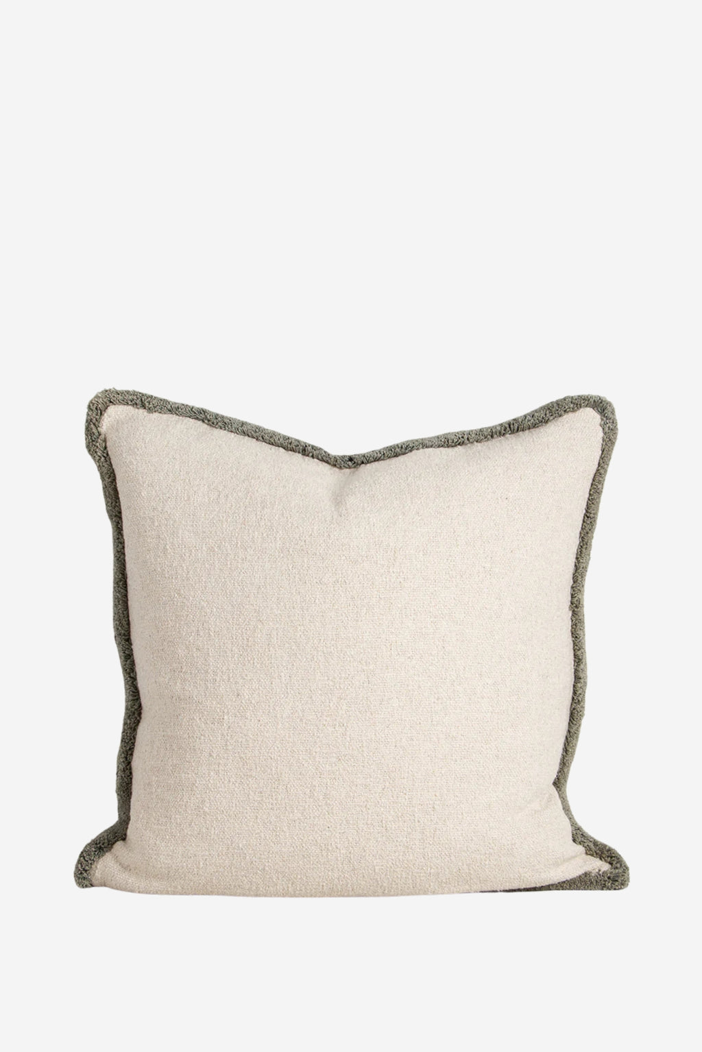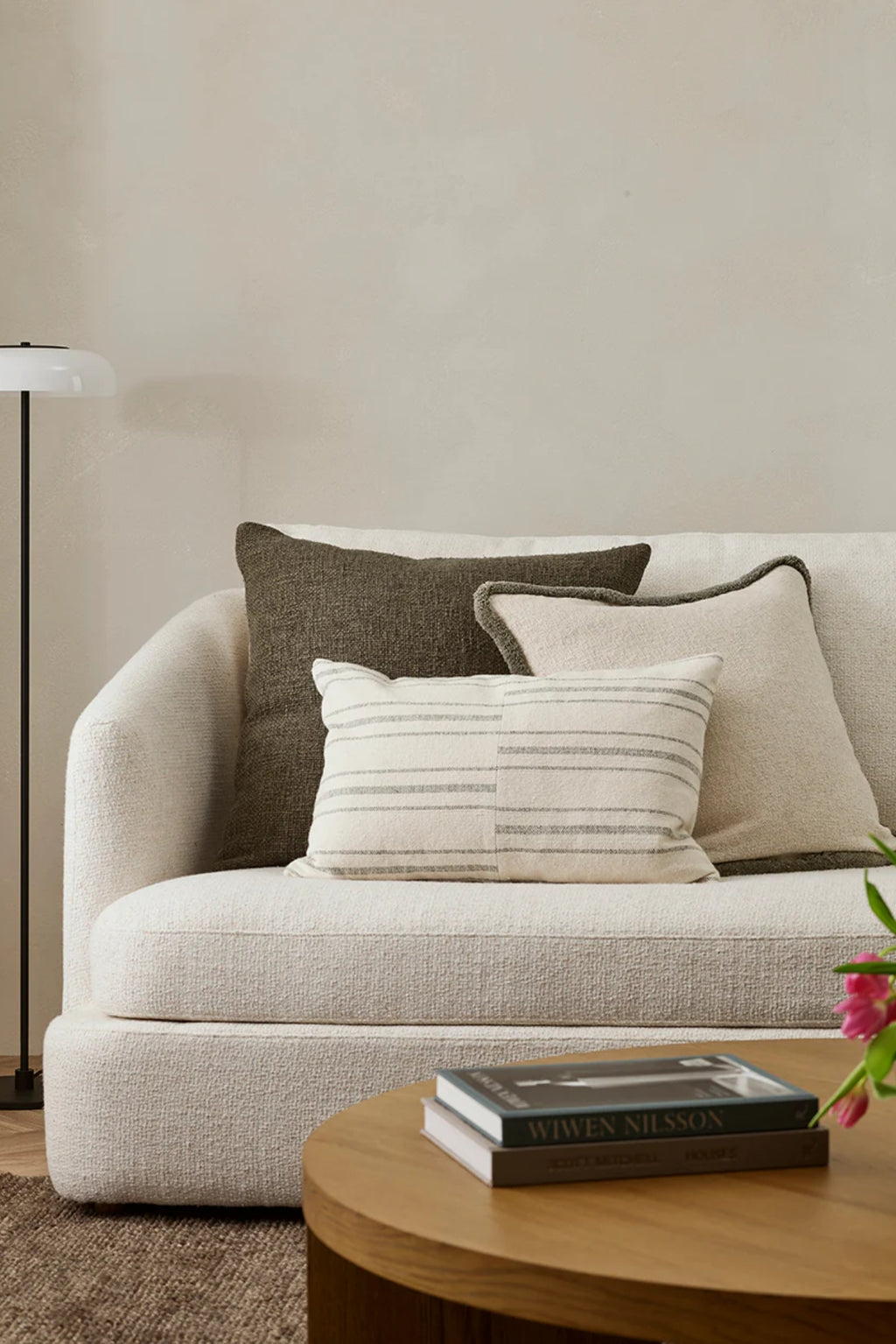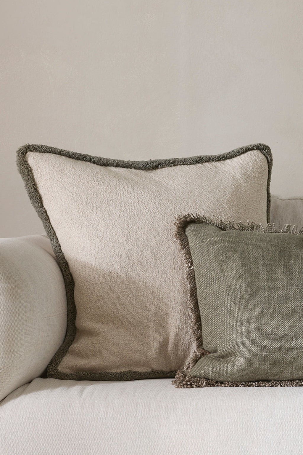 Featuring a soft, off-white bouclé base framed by a chunky cotton fringe, the Darcy cushion’s generous size and inviting texture is designed effortless layering. Made from a blend of cotton and recycled polyester, the sage-toned fringe adds a subtle element of colour that adds depth and contrast to cushion pairings.