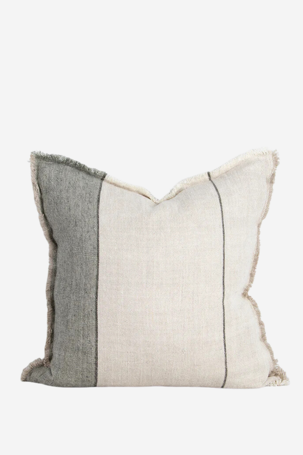 Country charm is given a contemporary twist, with the raw fringing and understated texture of the Frankton cushion. Crafted from thick, textural linen, the asymmetric design creates a modern take on classic style. Shades of ecru and sage create a relaxed feel.