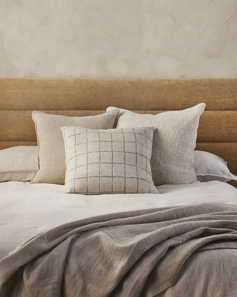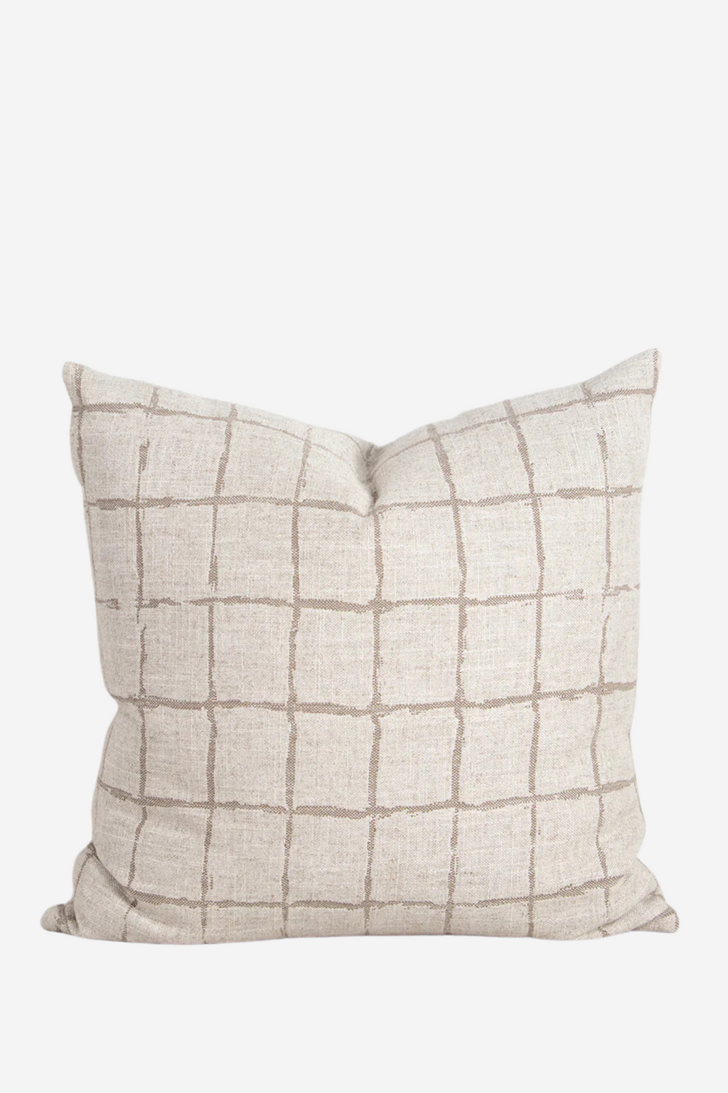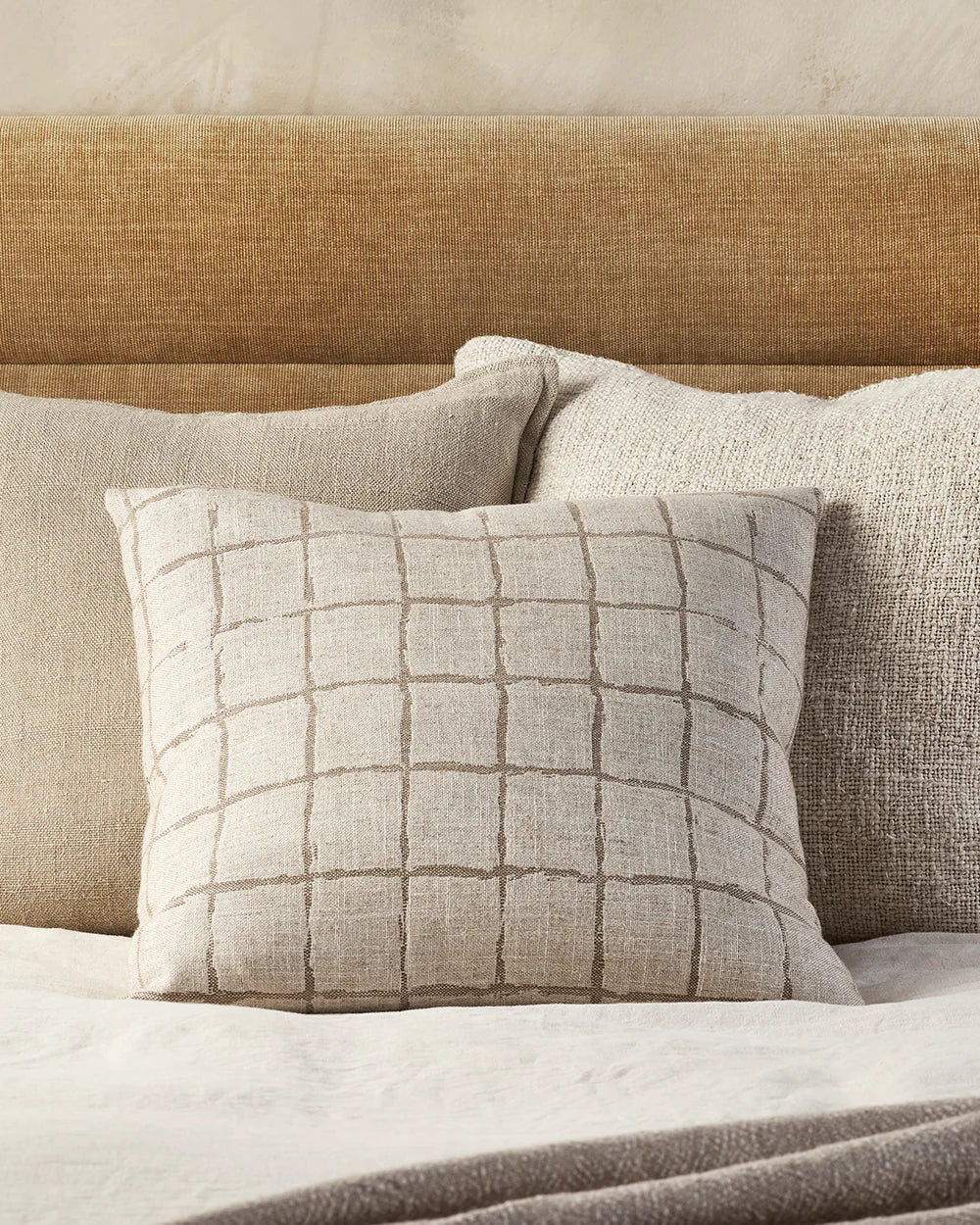 A Modern twist reimagines traditional fabrics in Natural and Taupe tones. Featuring a grid pattern.