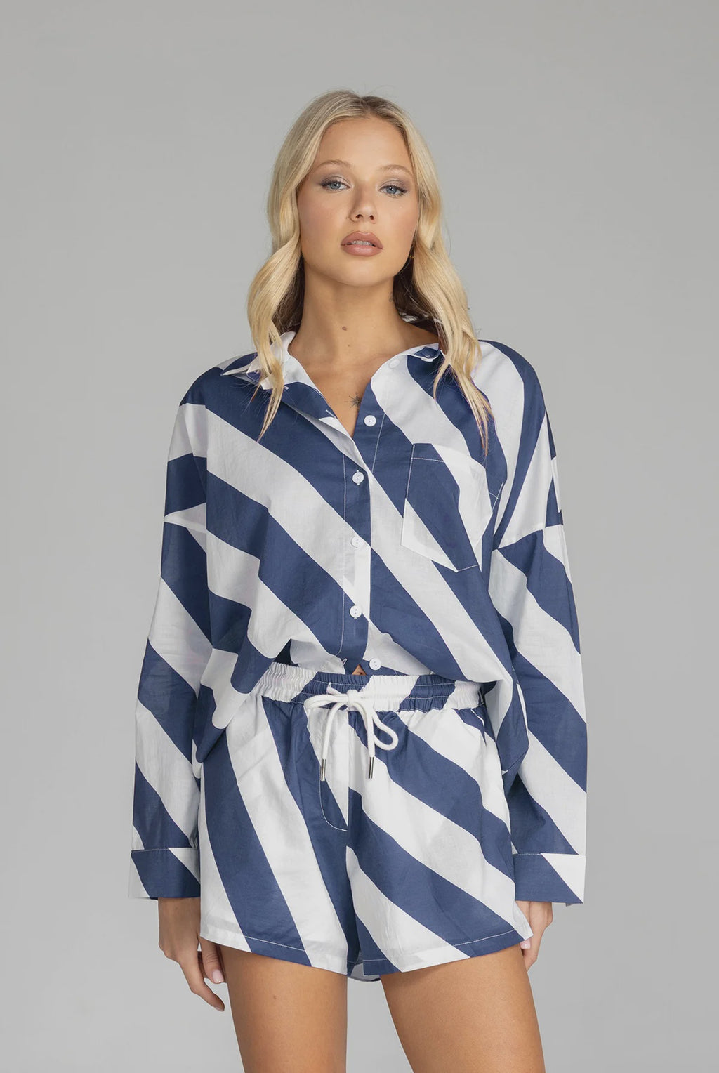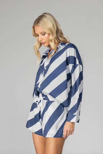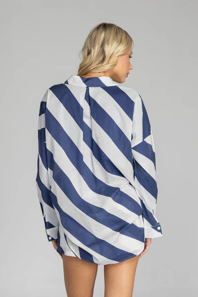 Elevate your style with this must-have shirt! Made from our exclusive navy/white diagonal stripe cotton voile, its relaxed fit and timeless details will make you feel effortlessly cool and infinitely chic. Featuring a drop shoulder, an inverted box pleat in the back, working sleeve cuffs, and a scooped hem, it's a true classic that will fast become your go to shirt.