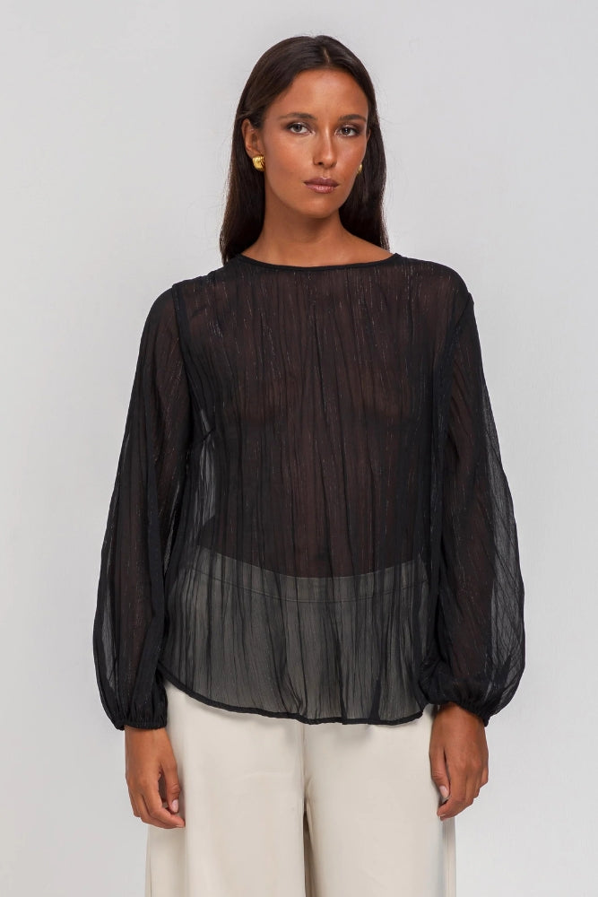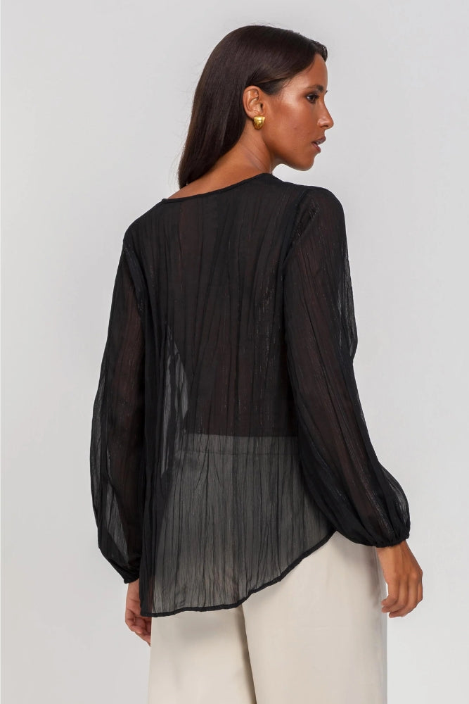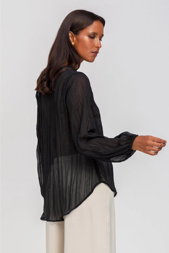Elevate your wardrobe with the Ingrid Top in black and silver lurex. This sheer top features billowed sleeves and a high neckline, making it the perfect choice for transitioning into autumn. Made with polyester lurex crinkle fabric, it exudes elegance and sophistication. Its long billowed sleeves, high bound neck, and scooped hemline add a touch of luxury to any outfit.