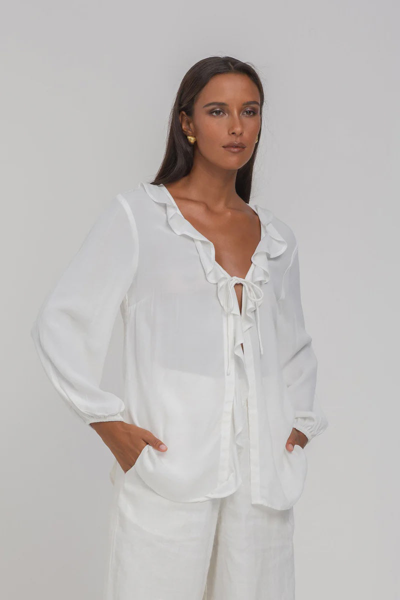 The plunging v-neckline and circular frill at the neck exude sophistication, while the front tie closure adds allure. Adorned with long, billowy sleeves and an elasticated hem, this blouse exudes opulence and charm. Finished with a curved hemline, it is the epitome of premium fashion.