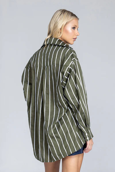Meet your new everyday staple. The Two Makes One Shirt brings together laid-back comfort and effortless style, featuring bold white stripes on a rich forest green base. Designed with an oversized fit and classic shirting details, it’s the perfect piece to wear buttoned up or thrown over anything.