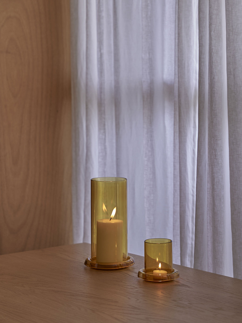 The Cascade hurricane lamp is a refined two-piece design crafted from delicate yet durable borosilicate glass. Designed by our in-house team, the form features a cascading base plate with negative detailing, creating the illusion of floating elegance. The tall vessel further enhances the design and protects the candle flame from extinguishing.
