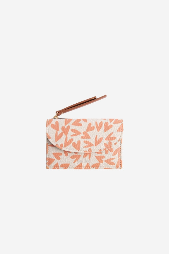 A handy size card holder purse in off white with coral pink hearts, gold slot pockets and a monochrome stripe lining. This purse features 3 card slots, a zipped coin section and a handy front pocket with popper closure.