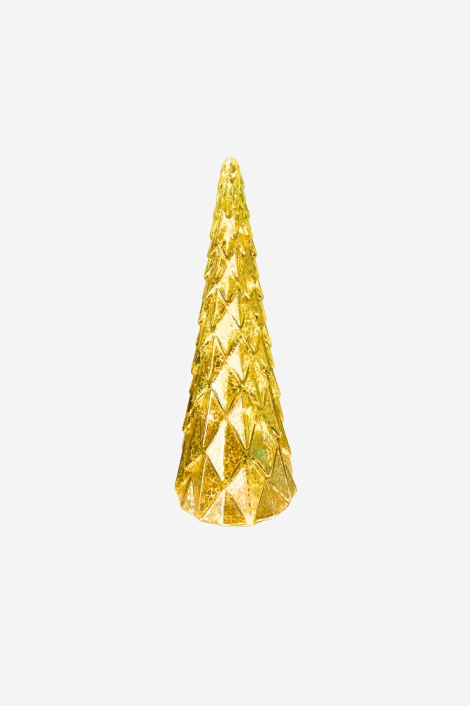 A 32cm tall gold textured glass Christmas Tree, perfect for the mantle or tabletop to add to your fun and festive arrangement.