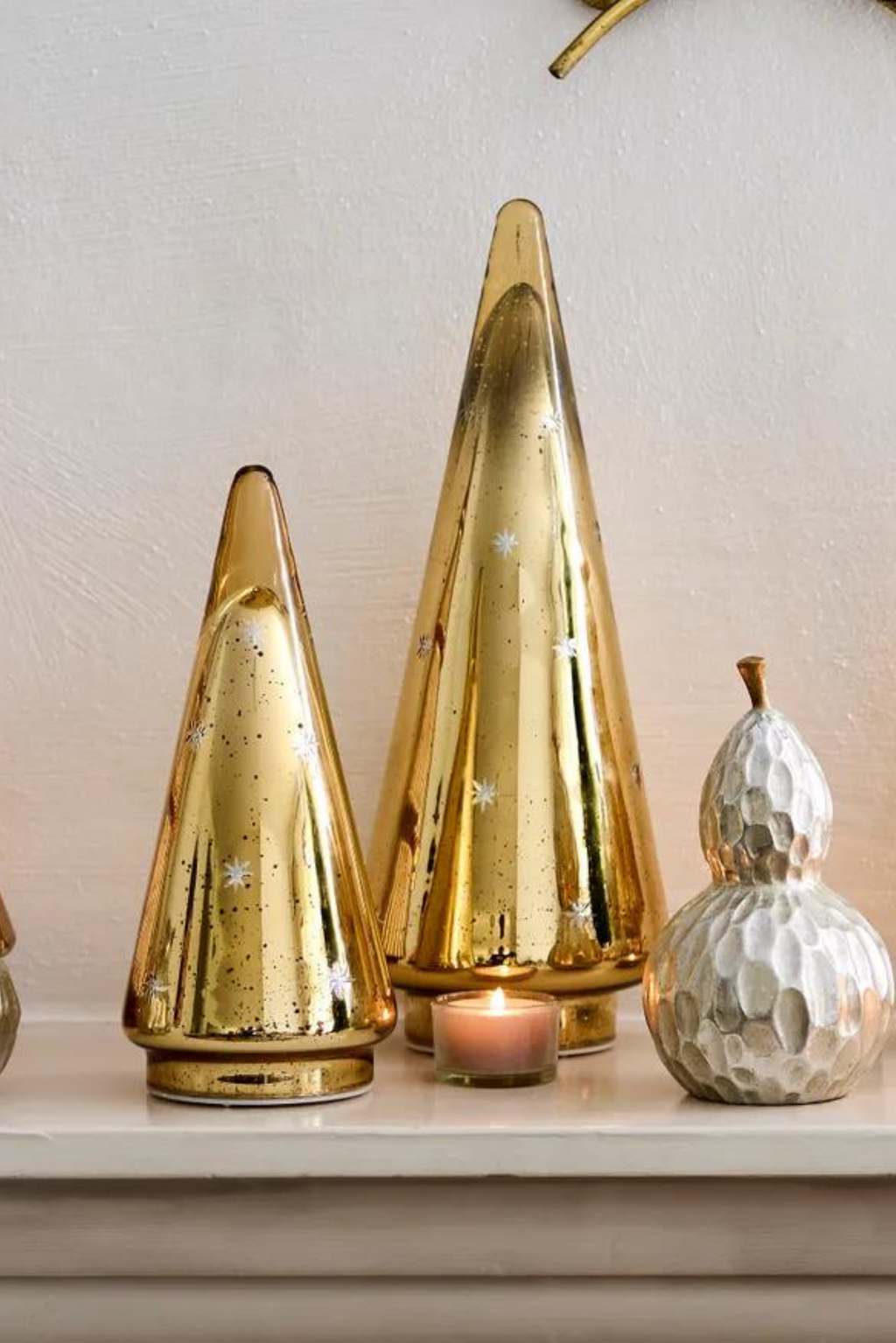 Antique glass Christmas tree with LED lights serves as a captivating focal point for festive ambiance. Use as a centrepiece or displayed on a mantelpiece.