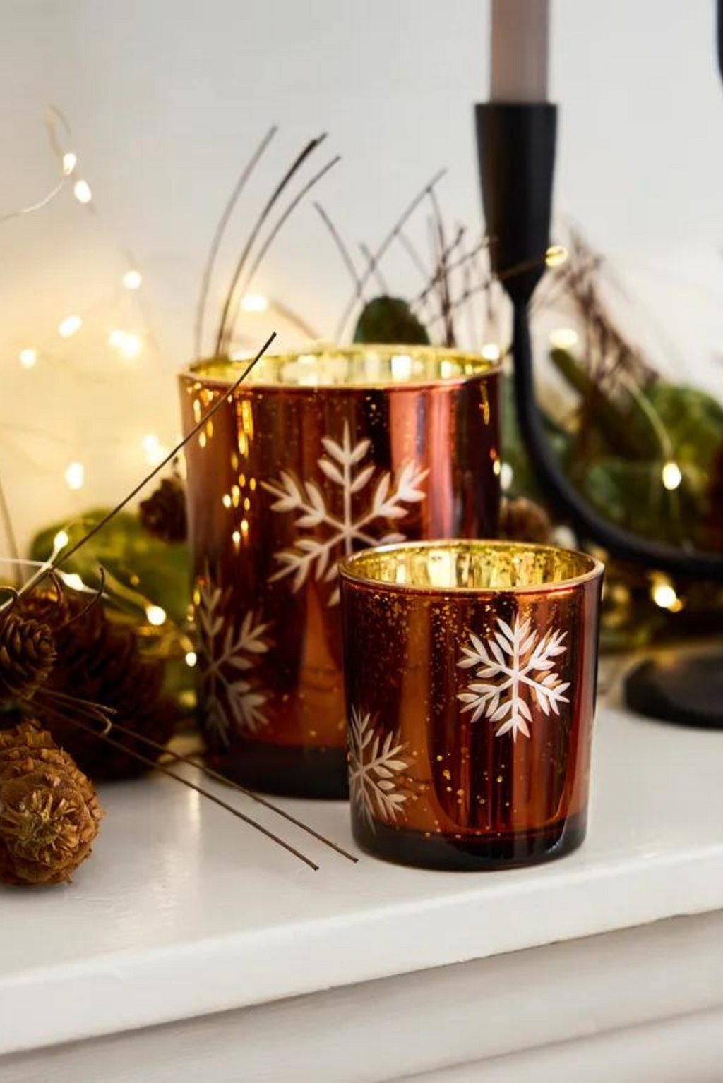 Glass votive with needle etching is a delicate and charming addition to a Christmas tablescape, bringing an elegant and festive touch.Colour: AmberComposition: GlassCare Instructions: Wipe with soft dry cloth.Dimensions: 10cmLx10cmWx12.5cmH