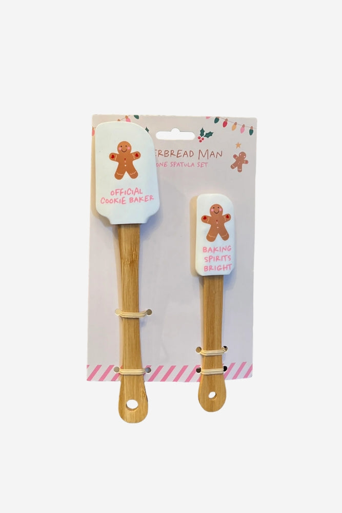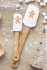 Christmas Gingerbread Man Spatula Set! This set includes two spatulas made from durable bamboo and cheerful white silicone heads featuring festive gingerbread prints. The large spatula is perfect for the household's official cookie baker, while the smaller one is designed especially for little helpers. Ideal for young chefs who love to lend a hand and take "Baking Spirits Bright" to the next level.