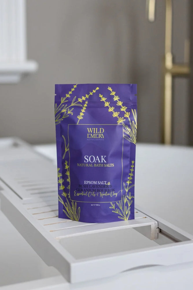 Australian made with natural sea salt, relaxing epsom salts and silky kaolin clay for a muscle and skin loving soak, infused with floral lavender and herbaceous but sweet geranium bourbon essential oils.