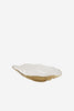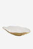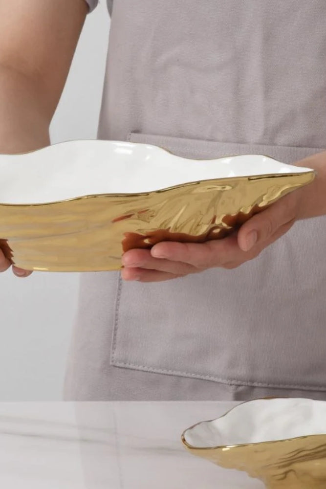 Oyster shaped bowl with golden exterior. Gorgeous natural shape of an oyster in a timeless and classic color combo is sure to amaze. Great for serving seafood favorites like shrimp, seafood salad, steamers or mussels . Or use it for guests to discard their empty clam/mussel shells! Striking and elegant gold finished high-fired porcelain with gleaming white interior. Food safe, dishwasher safe, tarnish and stain free. Easy Care.