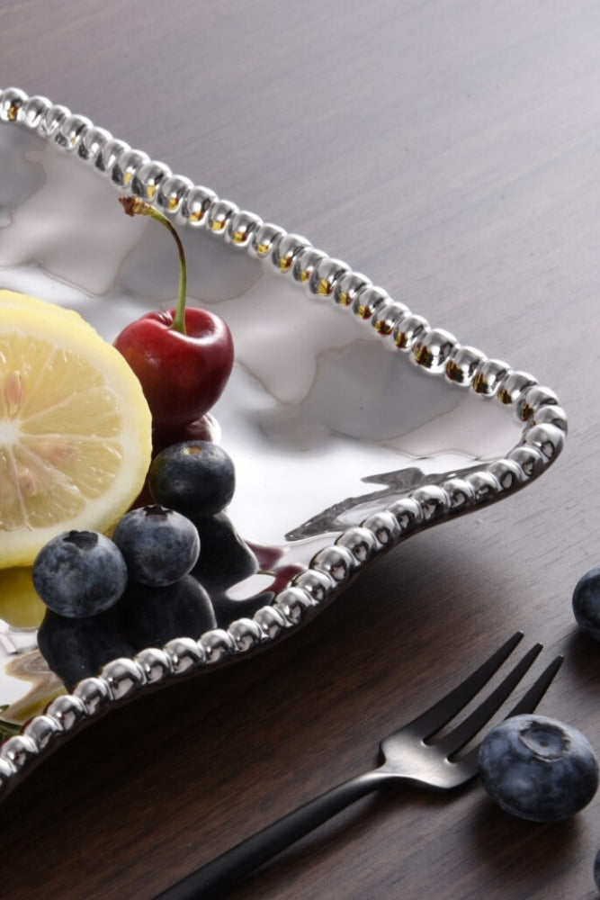 Small Platter in Verona. Suits all types of tables and is plenty chic for elegant occasions! Perfect for serving side dishes, appetizers, and desserts. Crafted in a stunning silver titanium finish with lustrous silver beads. Food safe, dishwasher safe, oven safe to 260°. Tarnish and stain-free. Easy Care.