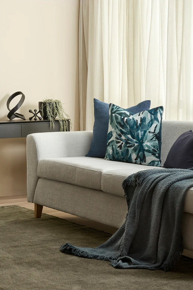 The Lumiere cushion is a beautiful floral design inspired by blooming dahlias. Featuring  a gorgeous hand painted watercolour mix of ink and sage, the Lumiere Diesel cushion is an eye catching statement that works beautifully with other plain cushions.