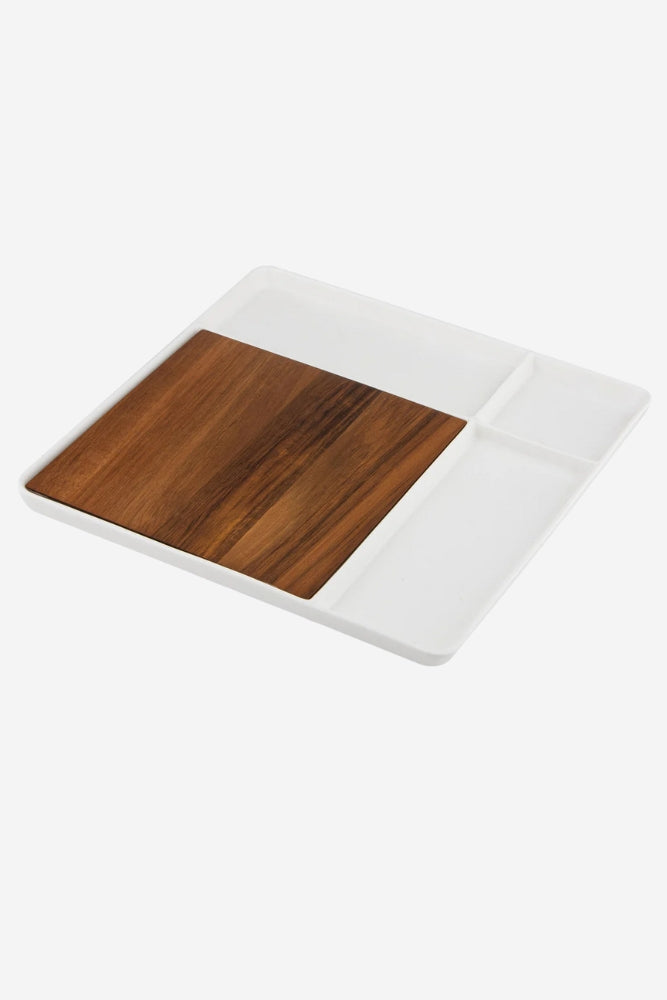 Discover the Essentials range – timeless kitchen + dining classics for any home. With matte finishes modern shapes and natural wood. Platter crafted from quality porcelain. Acacia wood board insert. Board fits in platter or can be used separately. Four sections on platter for snacks or crackers.  Part of our coordinated Essentials range