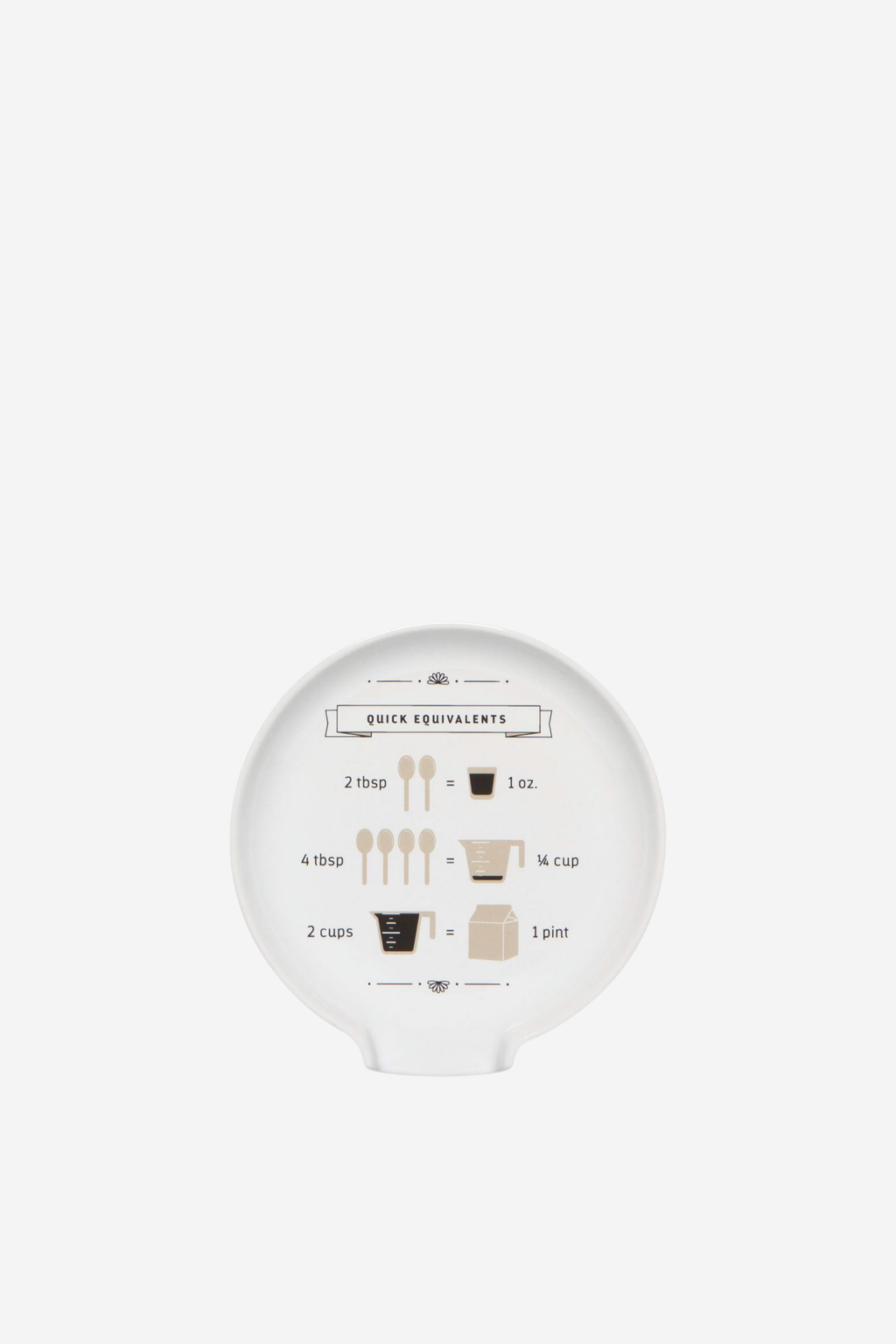 Stoneware circular spoon rest with ‘quick equivalents’ kitchen conversion image.