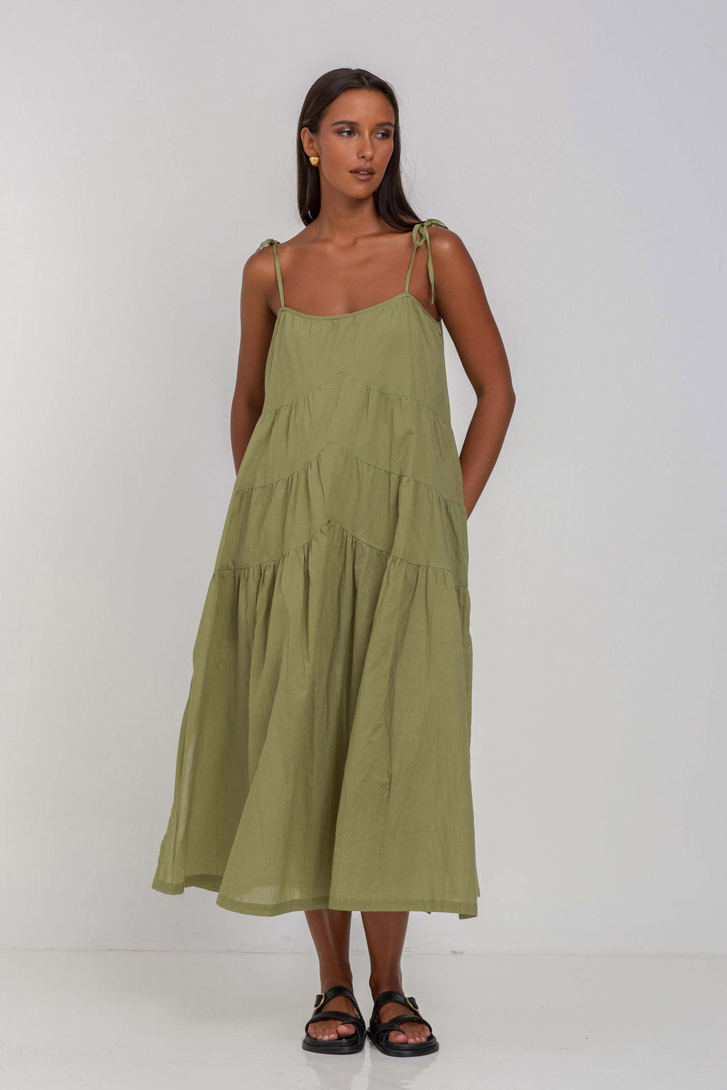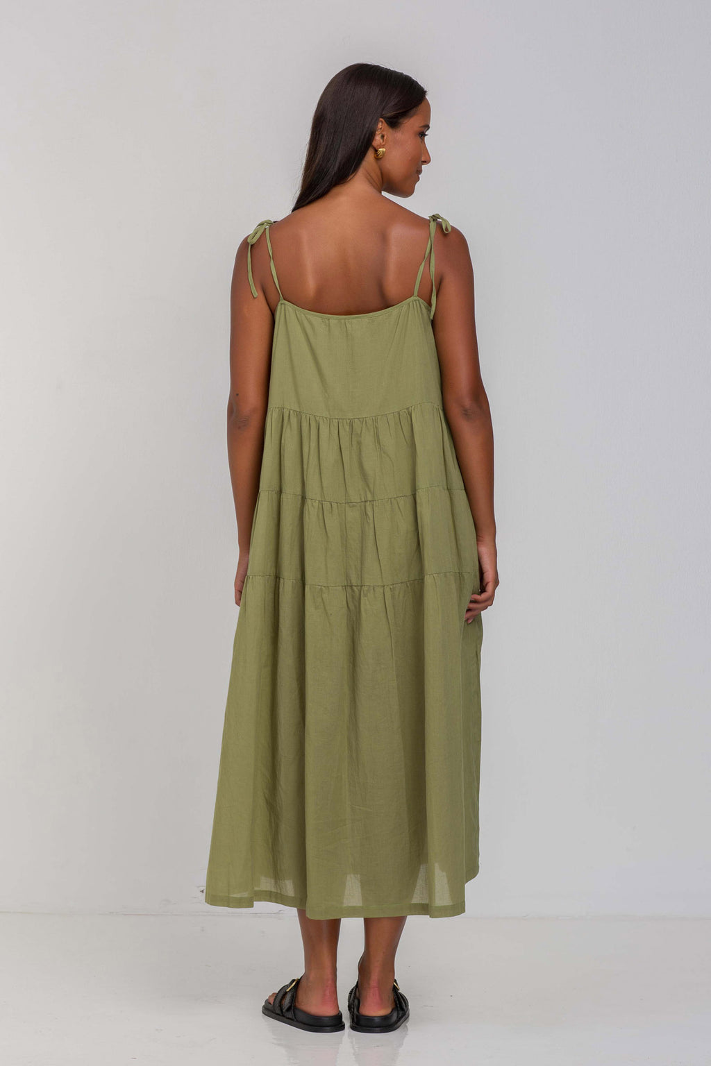 Experience a timeless moment in our Crisp Moss When Time Stood Still Dress. Crafted with luxurious cotton voile and lined with soft rayon, this elegantly relaxed dress features a sophisticated cami neckline, delicate shoulder ties, and a tiered body with side-splits. Adorned with a midi length, it exudes an air of exclusivity and refinement.