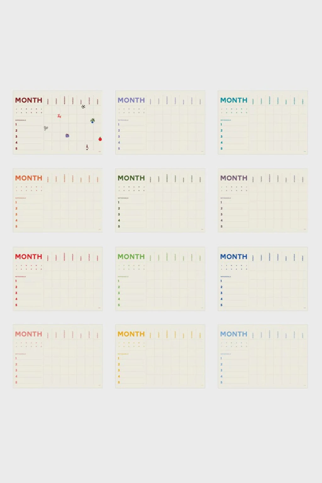 Each month is a different colour (12 colours x 2 = 24 total sheets).