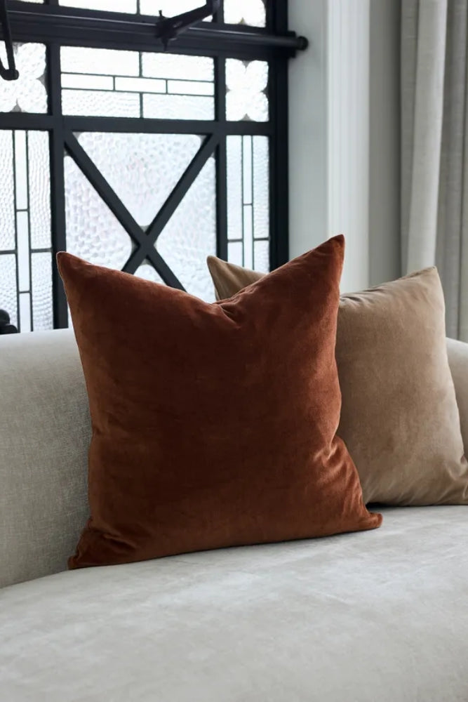 The Velvet Cushion in Cinnamon offers a warm red-orange brown hue with rich, earthy qualities that evoke strength and resilience. Much like the spice it’s named after, this cushion brings a sense of warmth and depth to any space. Perfect for accentuating and balancing soft neutrals like ivory and off-white, it adds a grounding yet sophisticated touch to your home decor.