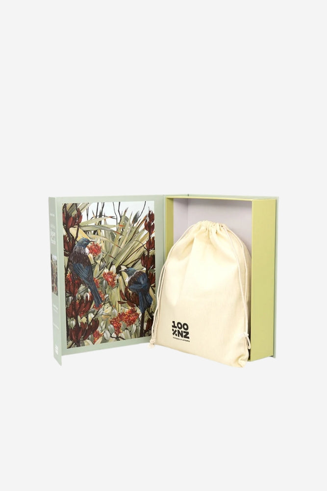 Discover the vibrant energy of New Zealand’s birdlife with our Artist Series 1000-piece jigsaw puzzle, Double Banger by Kirsty Nixon. This striking artwork portrays two Tūī perched on blooming red harakeke, surrounded by native foliage including pōhutukawa, tī kōuka, and tītoki. Packaged in a beautifully designed box and complete with a handy drawstring bag to keep the pieces organised, this puzzle is both a creative challenge and a celebration of Aotearoa’s natural beauty.