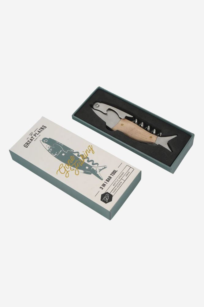 A perfect gift for fishing lovers and outdoor enthusiasts, this sleek 3-in-1 tool boasts a sturdy stainless steel and wood design, cleverly crafted in the shape of a fish.