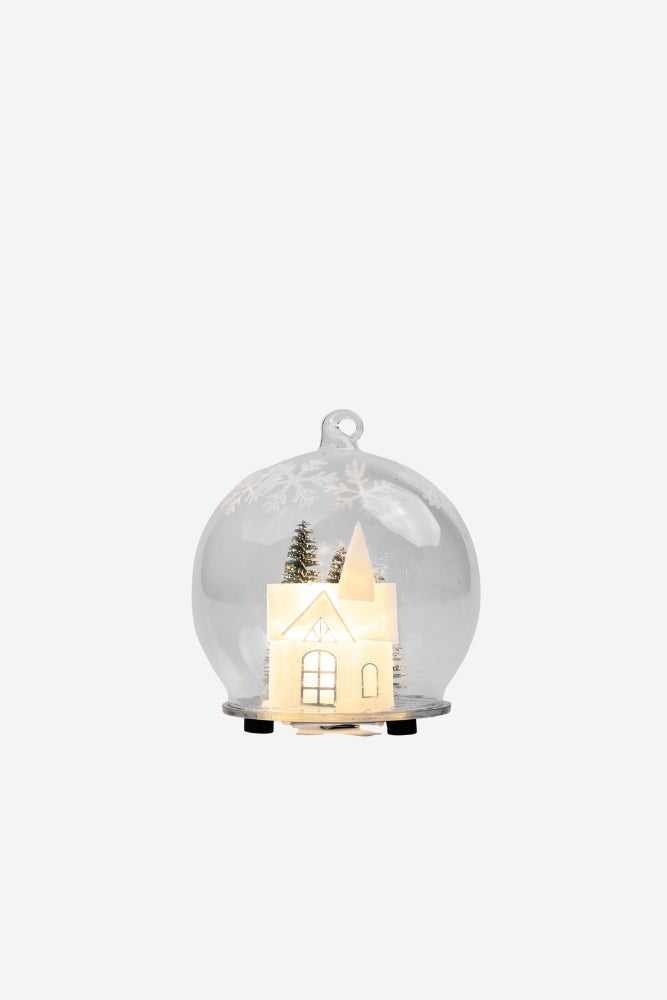 Glass globe encasing a church grounds scene that subtly lights up with light snowflake pattern on the glass exterior.