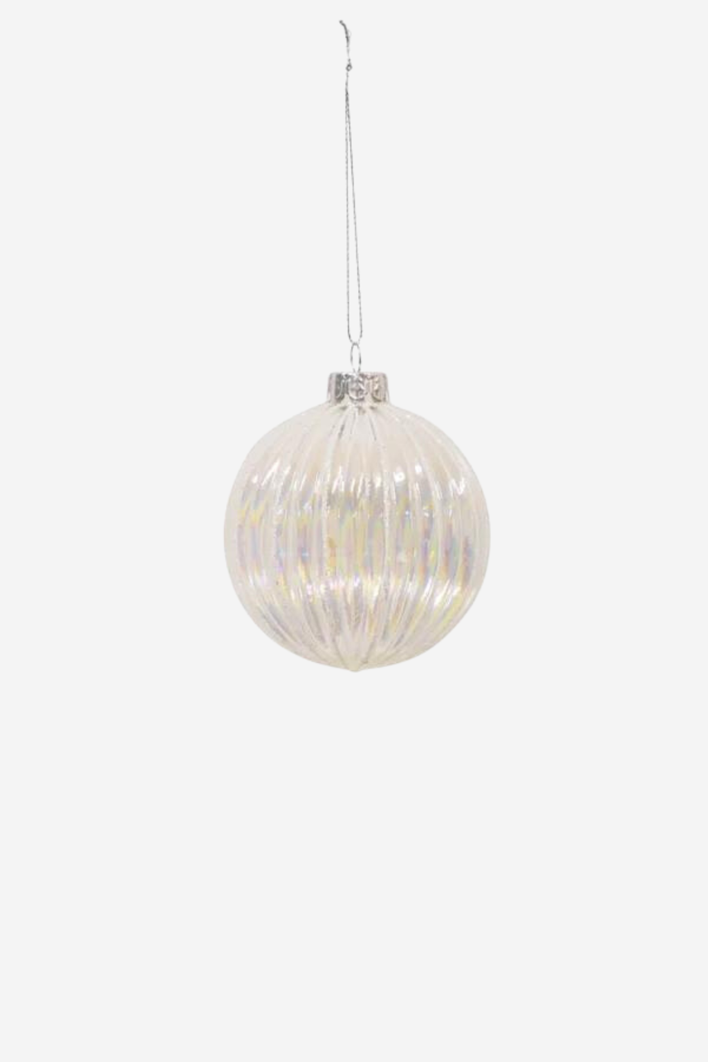 These fine glass baubles are fluted in shape with delicate glitter lines.