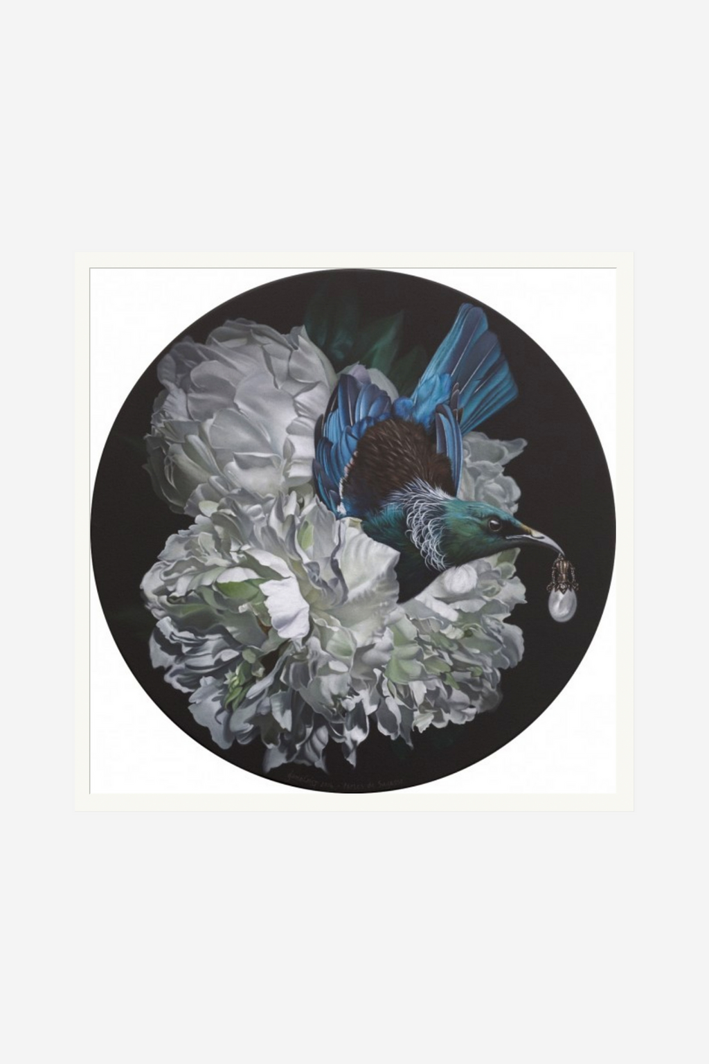 Amplifying the compassion and warmth of these heart-filled creatures, who live in the moment, she verges into portraiture. Placing Tui and Piwakawaka upon pedestals, she admires their wisdom and integrity through stories and legends which have been told. Crisp introduces objects of sentimental value to reflect their importance in an attempt to bring awareness of their fragile existence, an ongoing essence throughout her work.