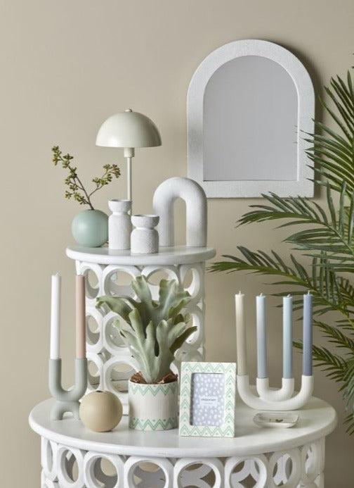 This Emporium Mesaria Candleholder is both stylish and practical. Made from cement with a white sandy textured appearance, it features a wide body and abstract silhouette. Place your favourite candle in it and display in the centre of a table or console for a sophisticated approach. Do not leave the candles unattended.