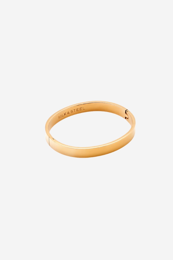 Wide 14k gold-plated stainless steel hinged bangle. Designed in New Zealand. 19.5cm.