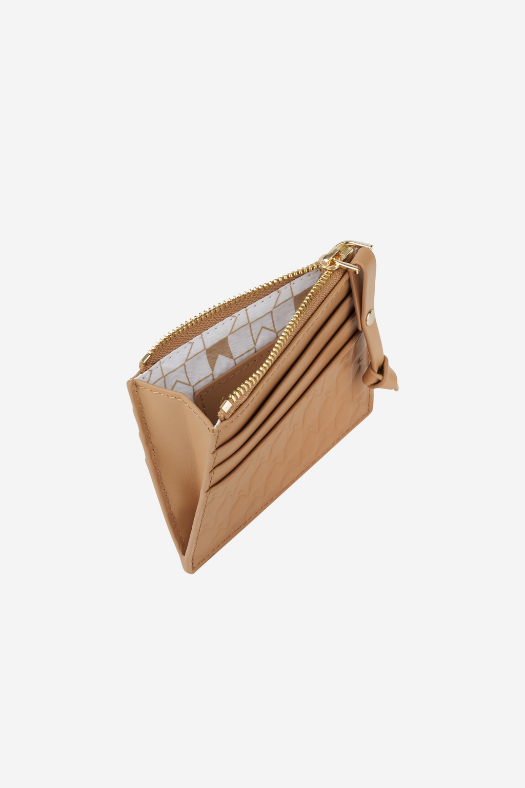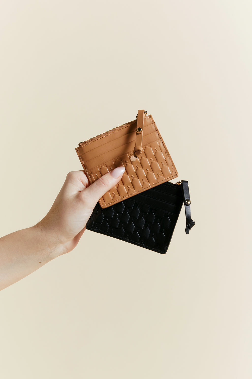 A utility essential, the conveniently sized Monogram Zip Card Holder is crafted in buttery soft nappa leather embossed with the signature Karen Walker monogram. The streamlined design features a secure coin/key compartment completed with gold-tone metal hardware and a playful knotted zipper.