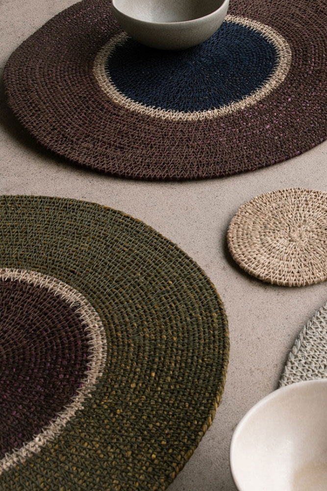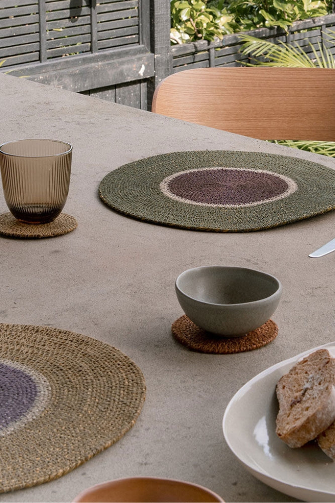 The placemats are handwoven in India using natural seagrass. Traditional weaving techniques celebrate the craftsmanship and create a unique, organic finish.