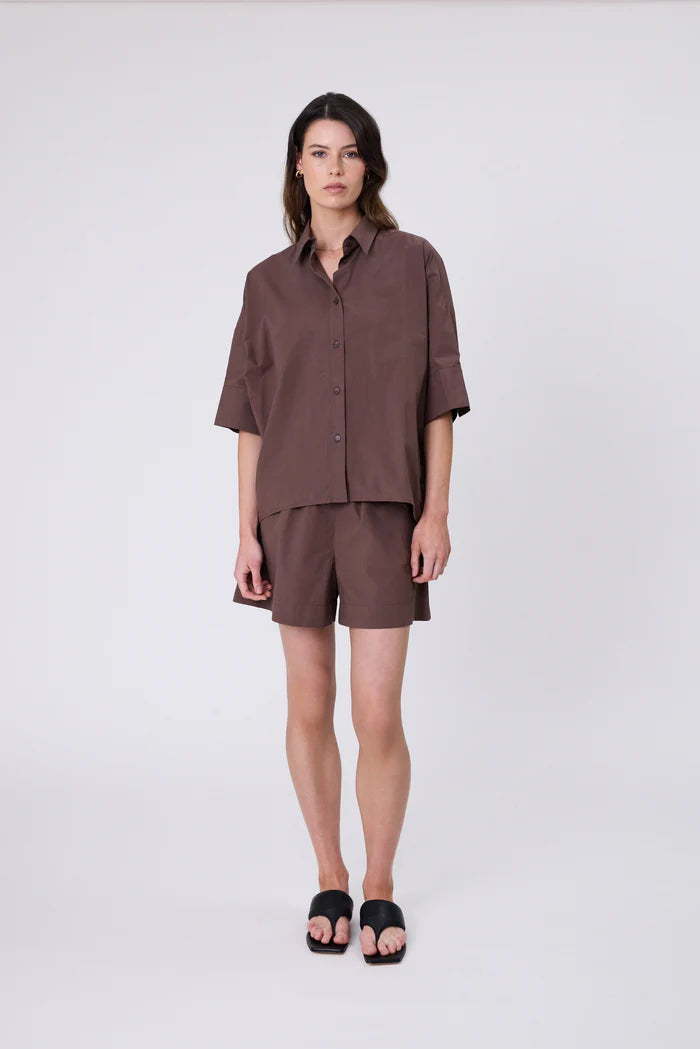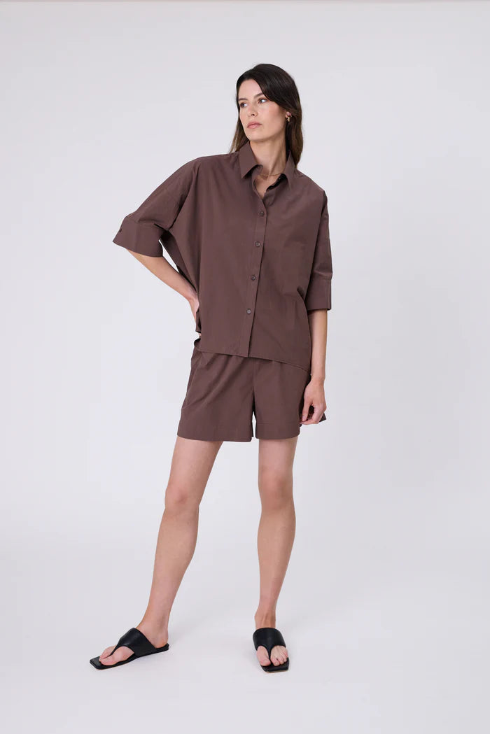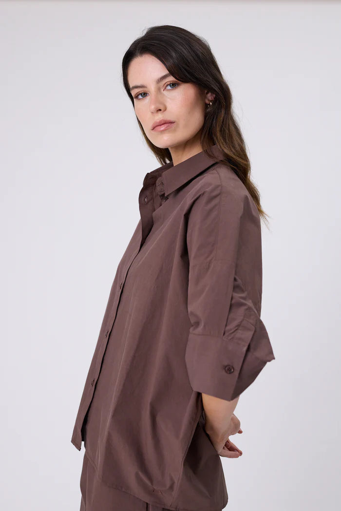 A twist on a classic, the Shoreline Shirt in Carob is a must-have for easy summer styling. Features an oversized, boxy fit with dropped shoulders and half sleeves finished with a wide cuff. Made from premium stonewashed cotton poplin, this shirt offers breathable comfort and a luxurious hand-feel. The back yoke and seam details add subtle structure and volume, and the curved high-low hem creates a flattering shape. Versatile and easy to style, wear it buttoned up for work, open as a lightweight layer.