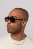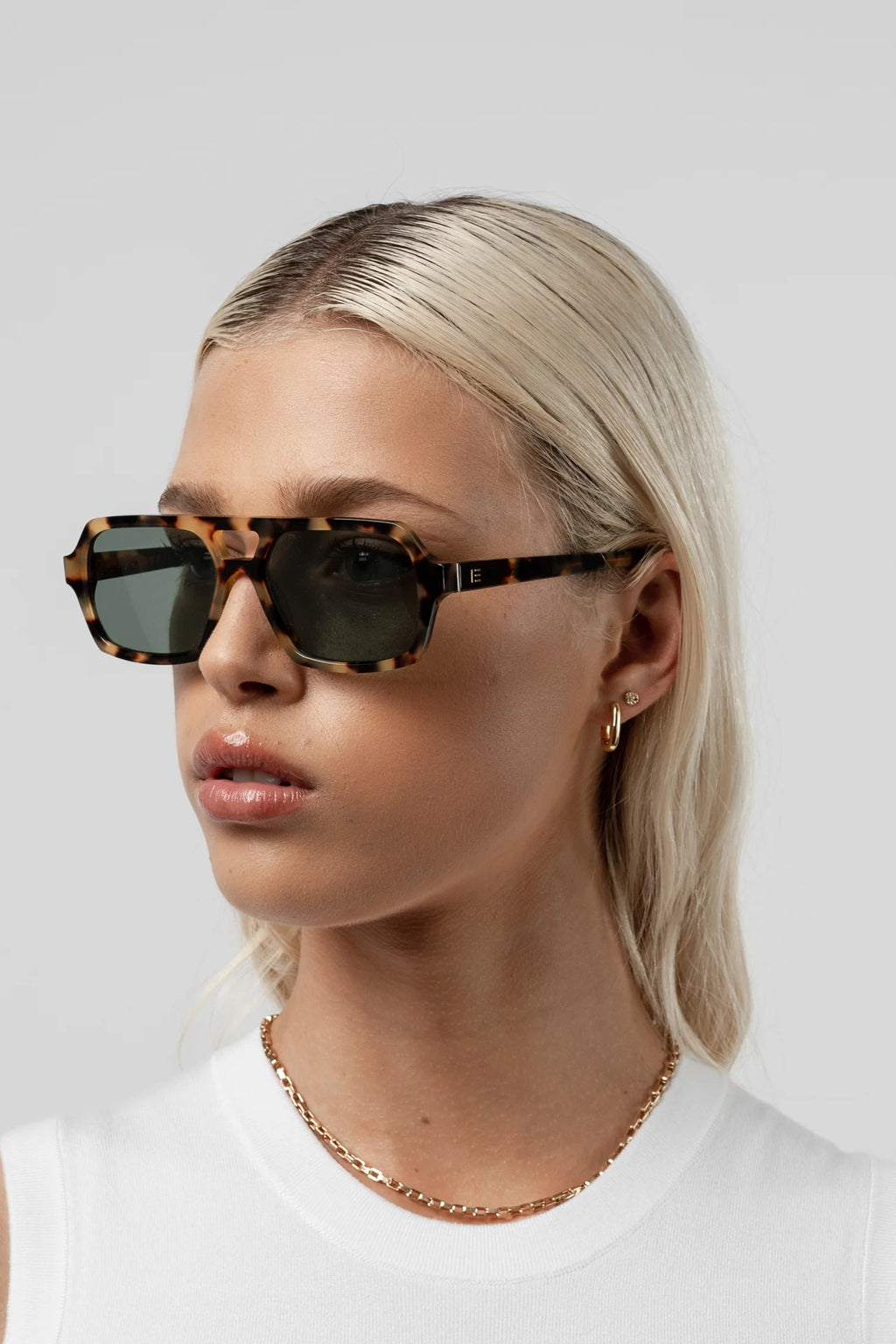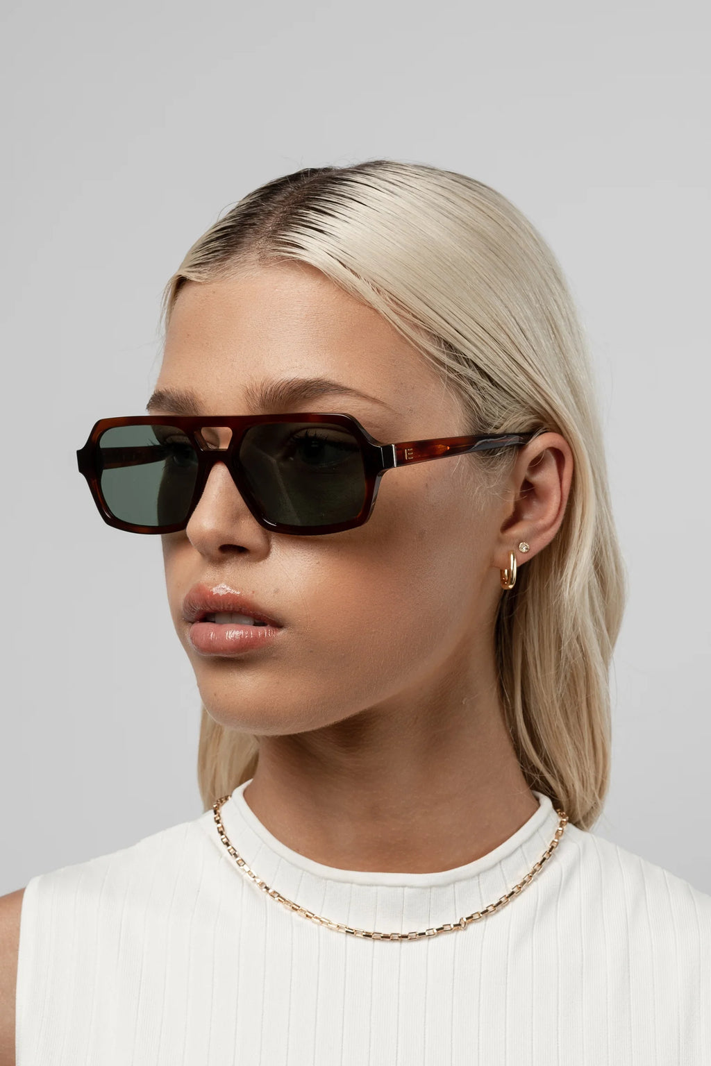 The Lola is a take on a chic 1970's Aviator. The silhouette has been modernised with a rectangular form factor, and low-base CAT2 lenses with an edgy, premium finish. The temples (arms) are detailed with our logo in gold as well as metal trims with IOE de-bossing.