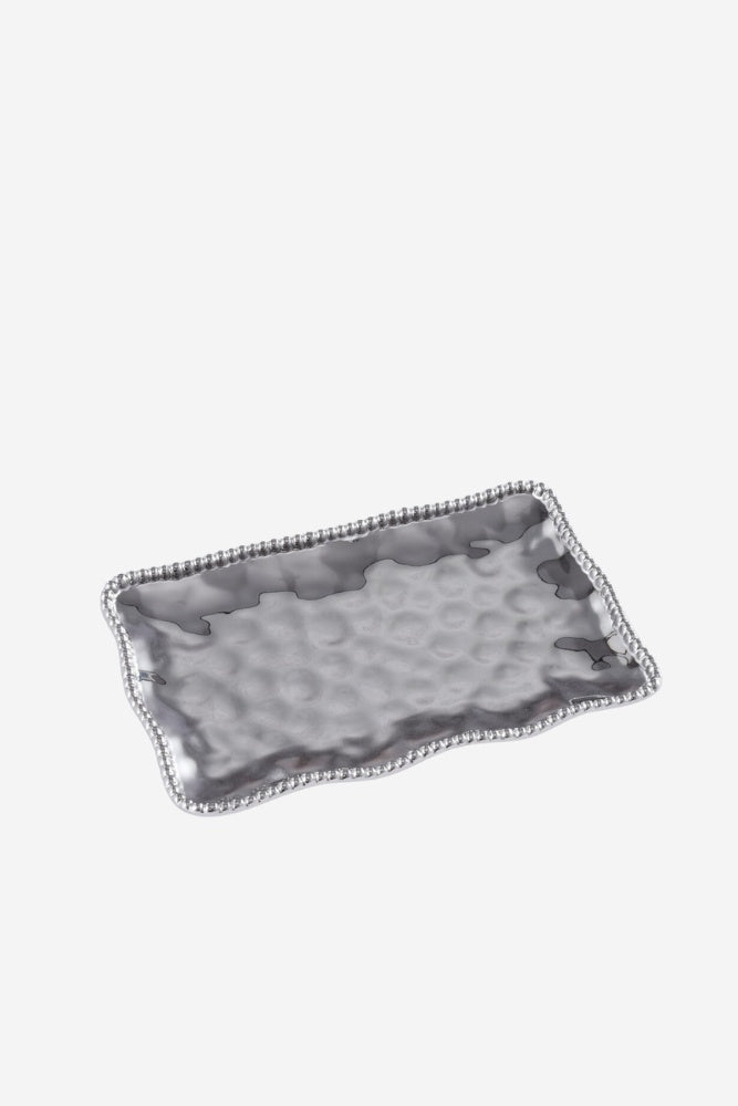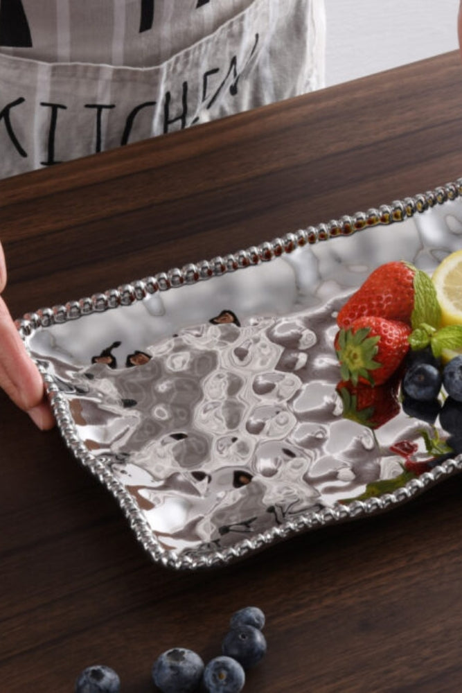Small Platter in Verona. Suits all types of tables and is plenty chic for elegant occasions! Perfect for serving side dishes, appetizers, and desserts. Crafted in a stunning silver titanium finish with lustrous silver beads. Food safe, dishwasher safe, oven safe to 260°. Tarnish and stain-free. Easy Care.
