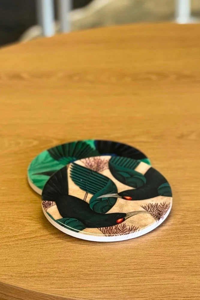 Artwork by Kiwi artist Kathryn Furniss featuring the extinct male and female Huia, flying gracefully across a background of Nikau.