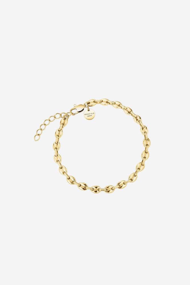The coffee bean chain bracelet by Rosefield is made with 14K yellow gold plated stainless steel, making it a refined and unique layering piece for your wrist stack. Pair it with the matching coffee bean chain necklace.