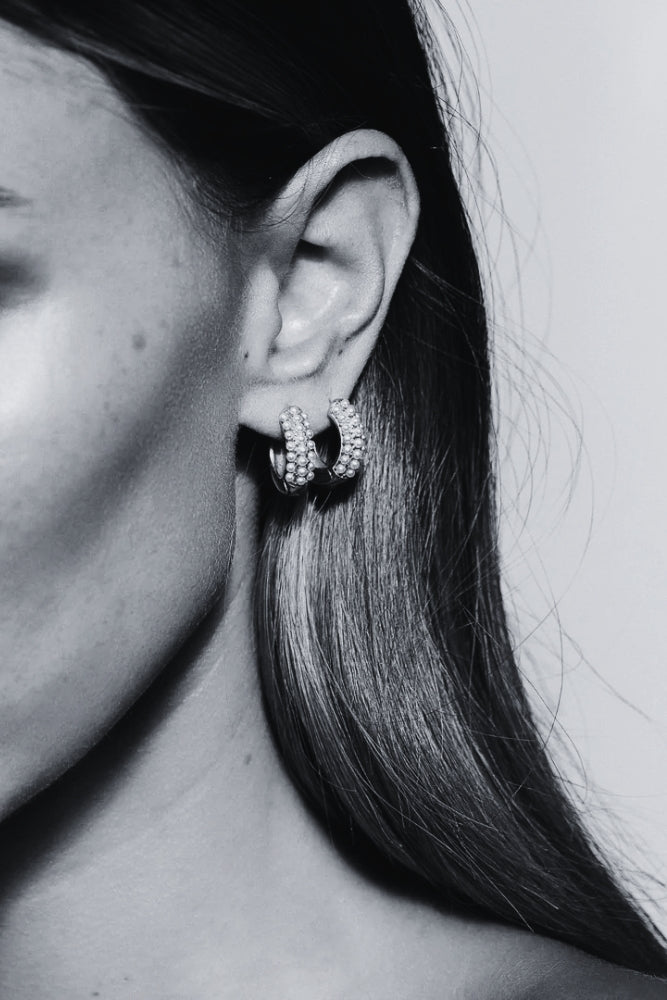 Crafted from durable, high-quality, hypoallergenic silver stainless steel, these hoops offer both comfort and durability. The combination of silver and pearl creates a luxuriously cool, contemporary vibe. As seen here, pair with the Hera Hoop Earrings and the Siren Pearl Ear Cuff, to complete the stack.