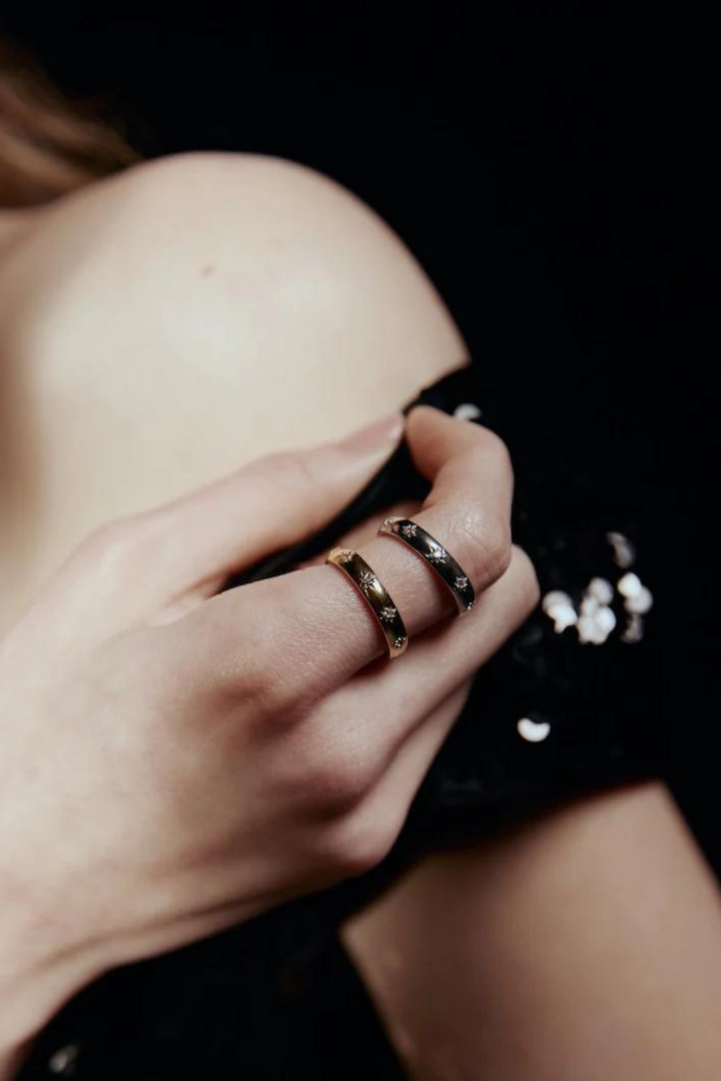 Allow us to present the Lumiere ring, a must-have addition to your jewellery collection, meticulously handcrafted from 14k gold-plated sterling silver. This sleek ring is adorned with stars and clear cubic zirconias, adding a touch of sparkle to your look.