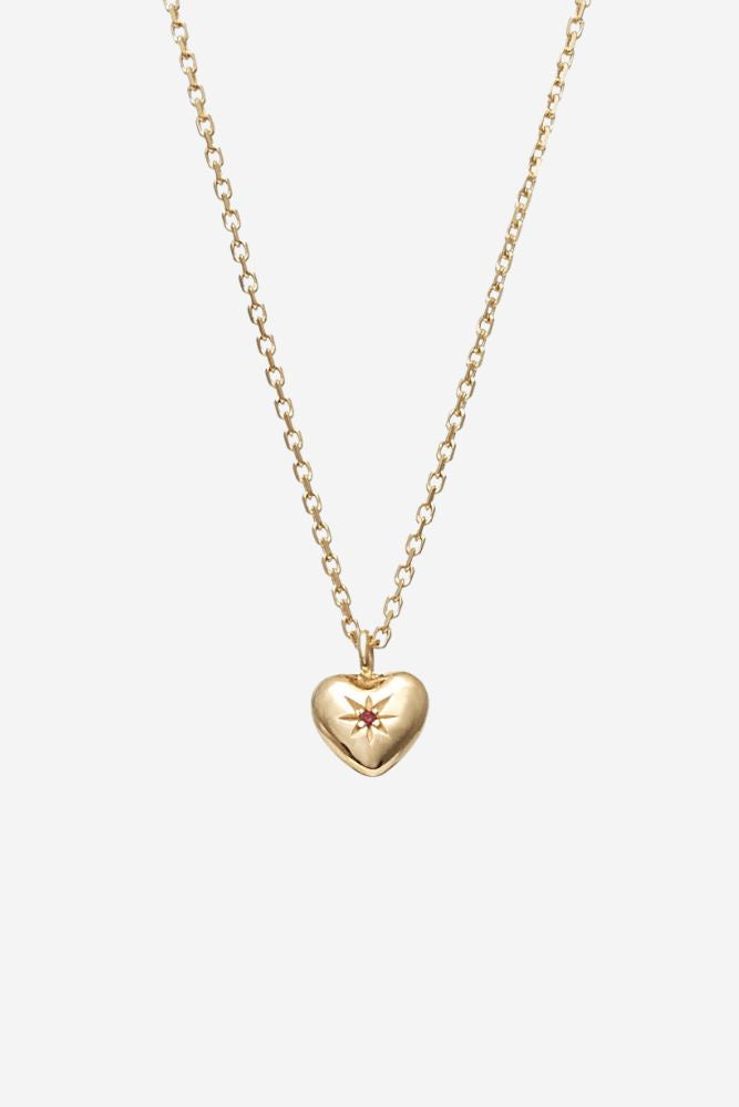 Handmade by artisans in 14k gold-plated sterling silver, this delicate necklace features a petite puffed heart charm with a North Star–inspired centre, set with a genuine ruby - a stone said to symbolise love, passion, and emotional strength. Suspended from a fine link chain and finished with our signature extension, offering styling versatility for any neckline.