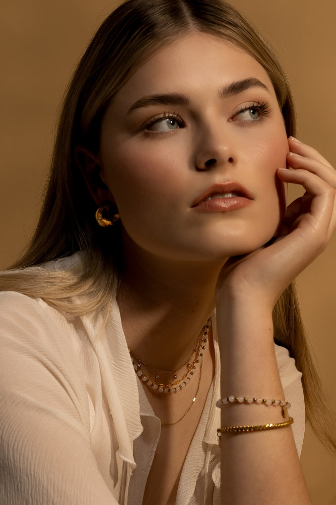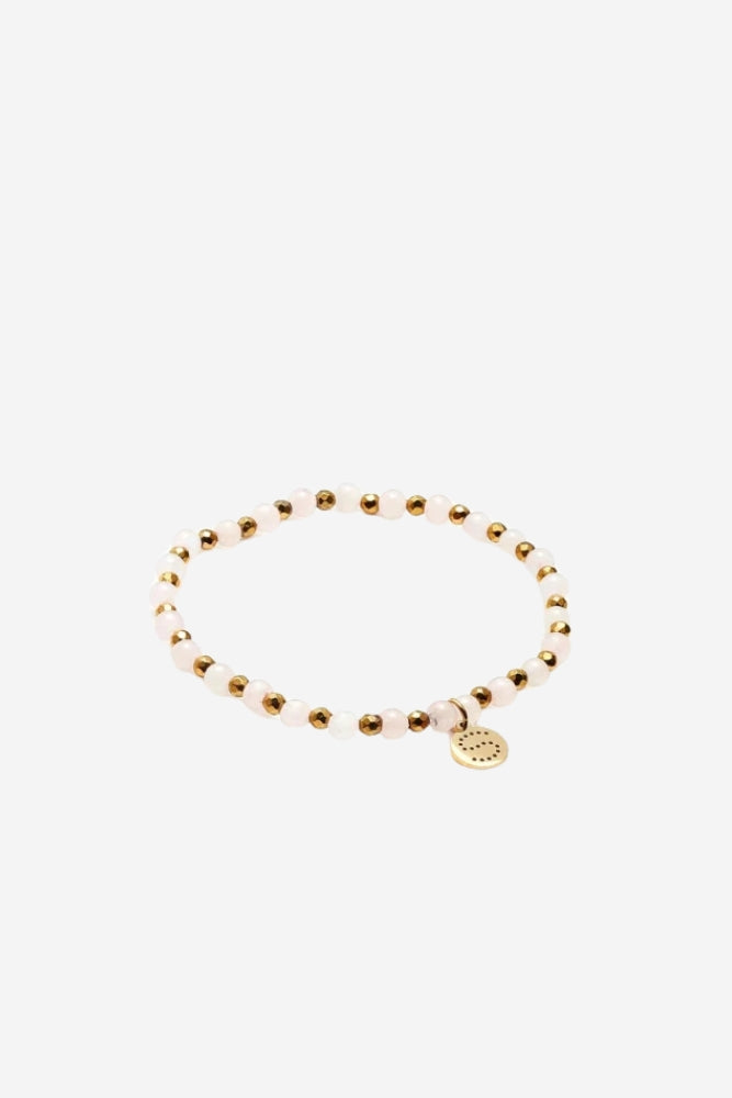 Embrace summer elegance with our Rose Bracelet from Golden Hour. Hand strung with natural rose quartz gemstones and gold hematite beads, this piece radiates love and vitality.