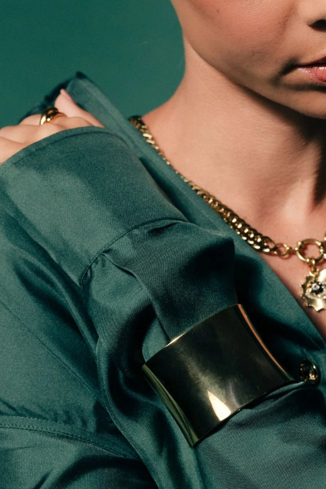 The Titan Cuff in 14k gold-plated stainless steel exudes a sense of luxury with its rich finish and vintage-inspired design. This wide, high-shine cuff features an open back for a sleek, modern fit, making it the perfect statement piece to wear alone or as a pair for maximum impact.