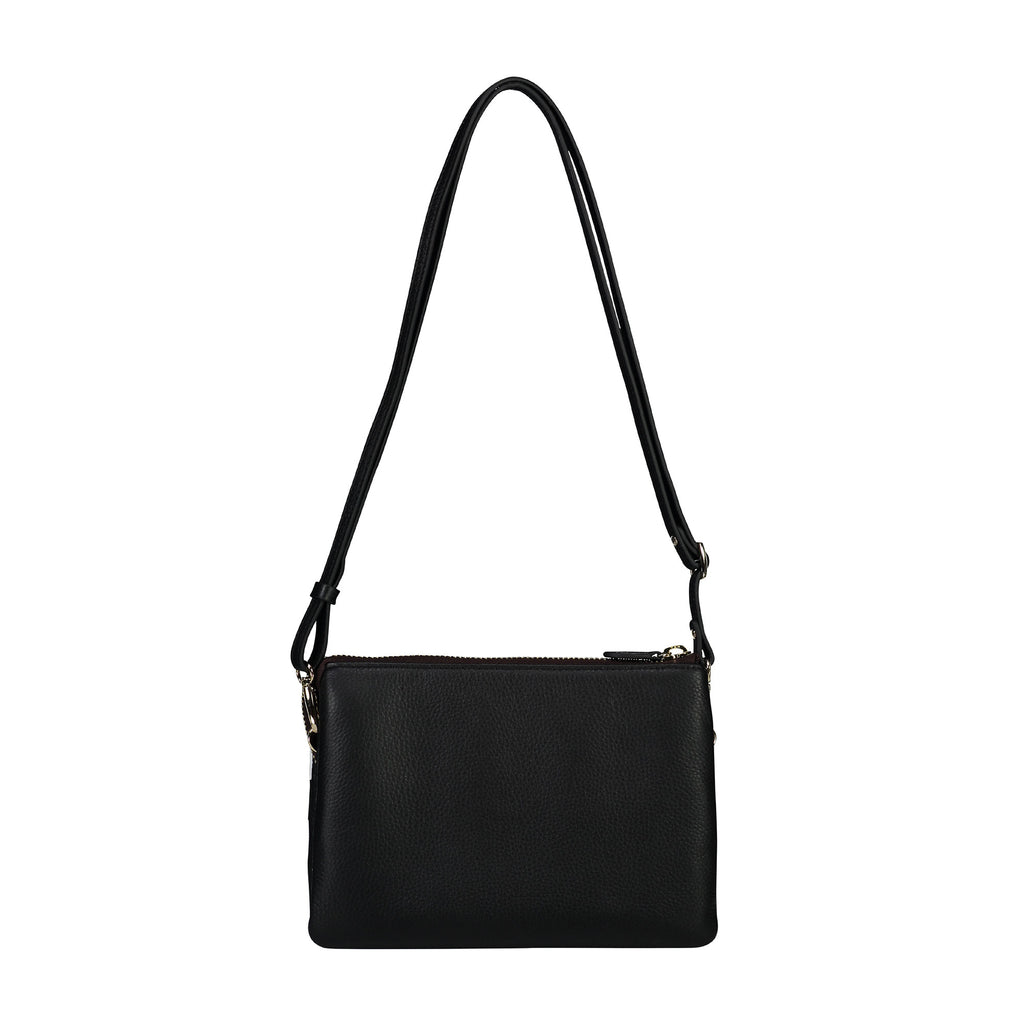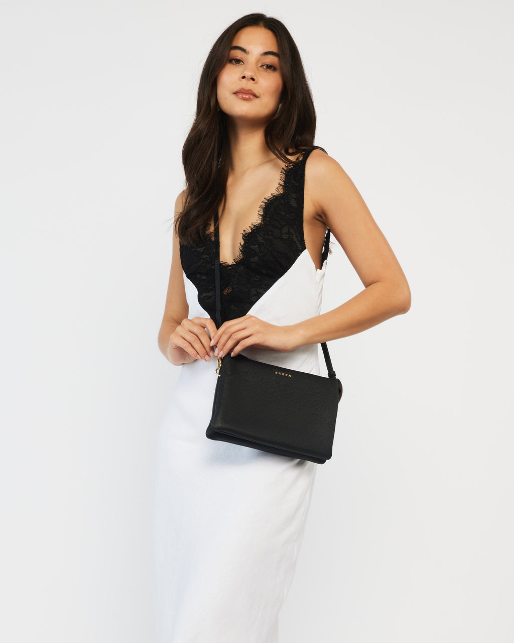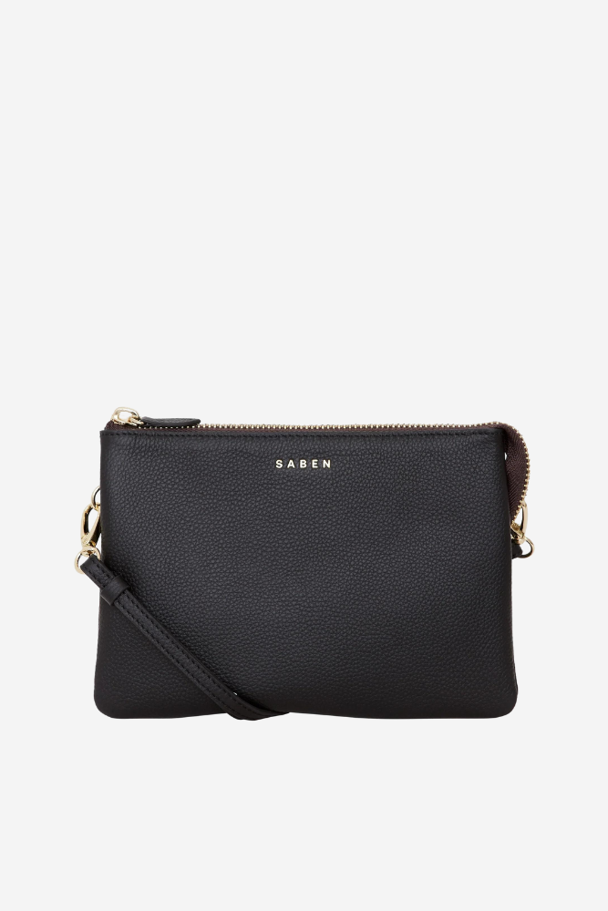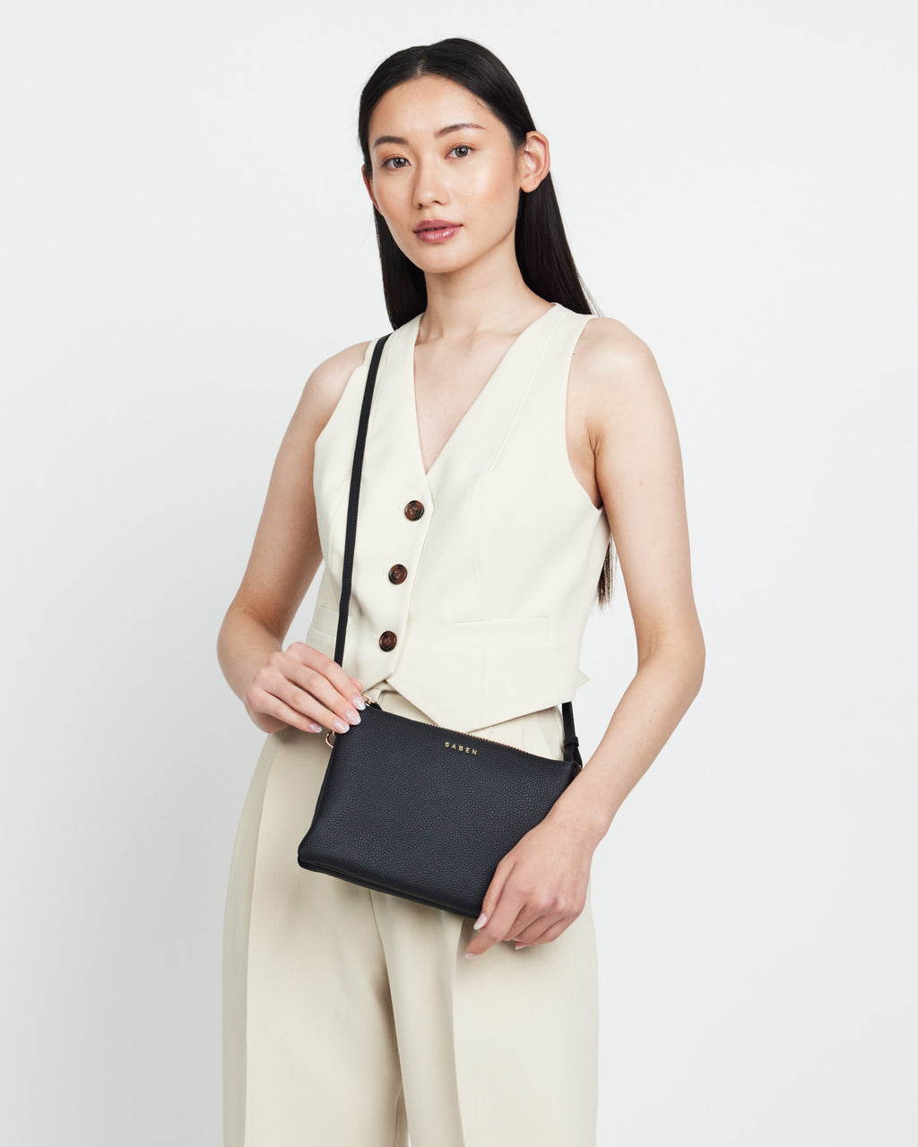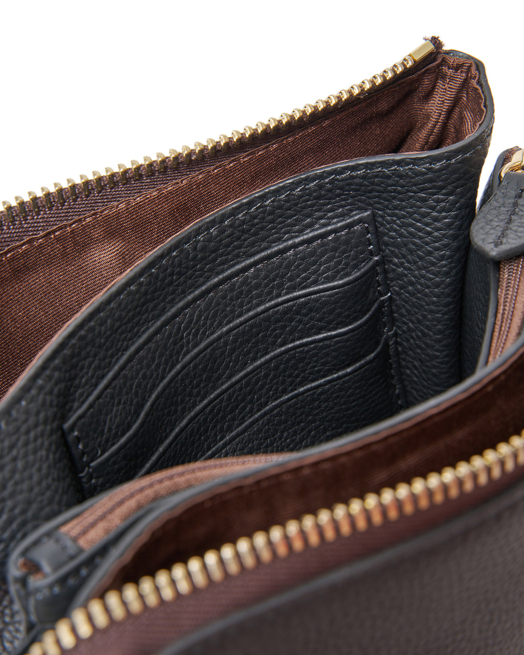 Details: Detachable and adjustable long leather strap to be worn over the shoulder or across the body; six drop card slots; gold plated hardware; interior secure zip pocket; outer zip fastening.