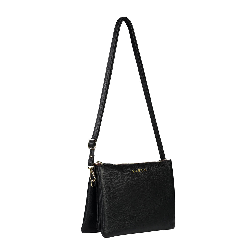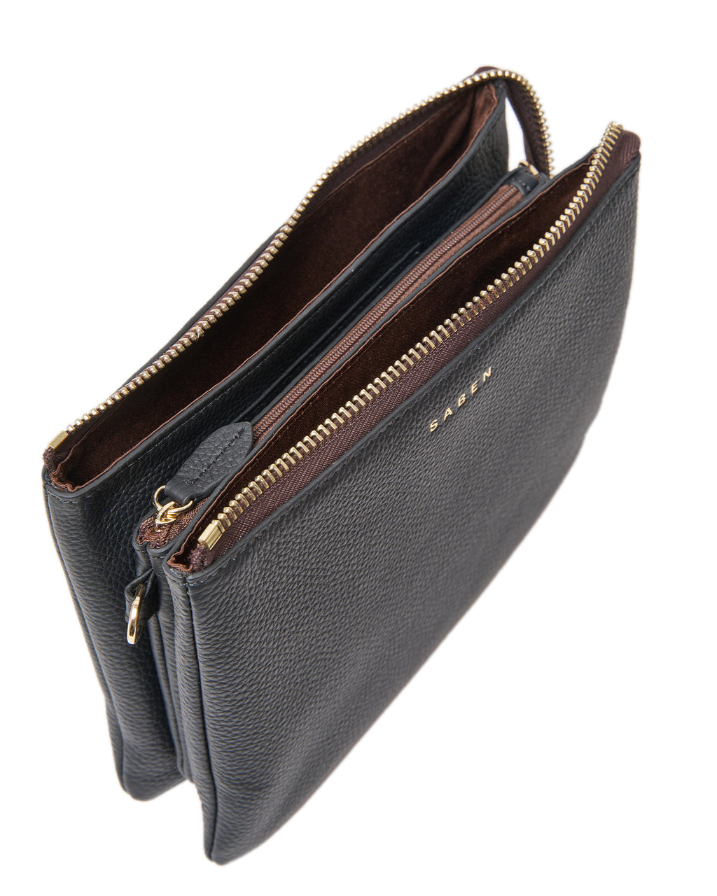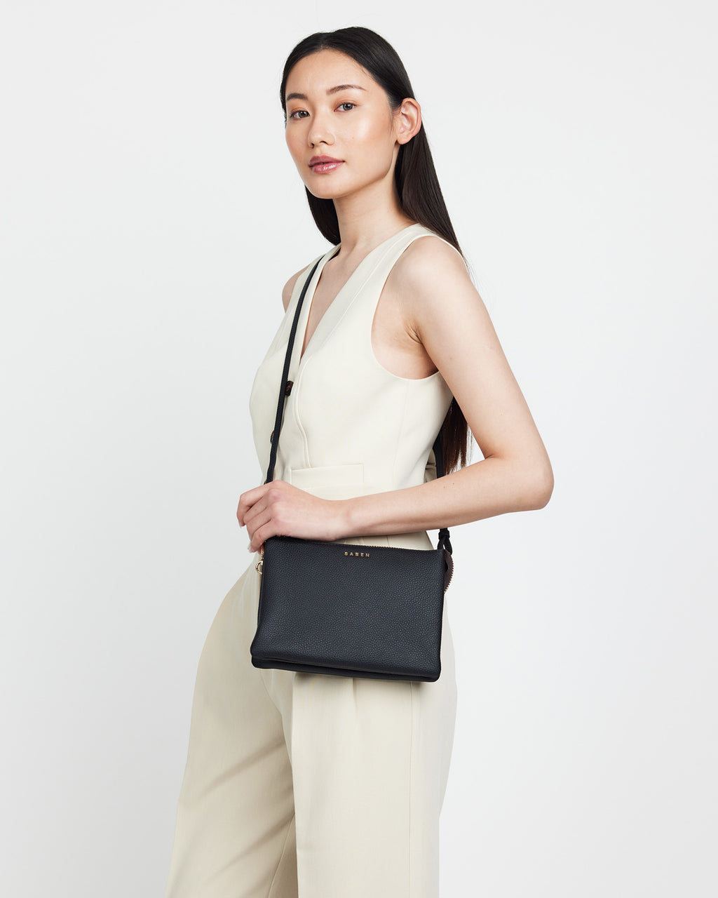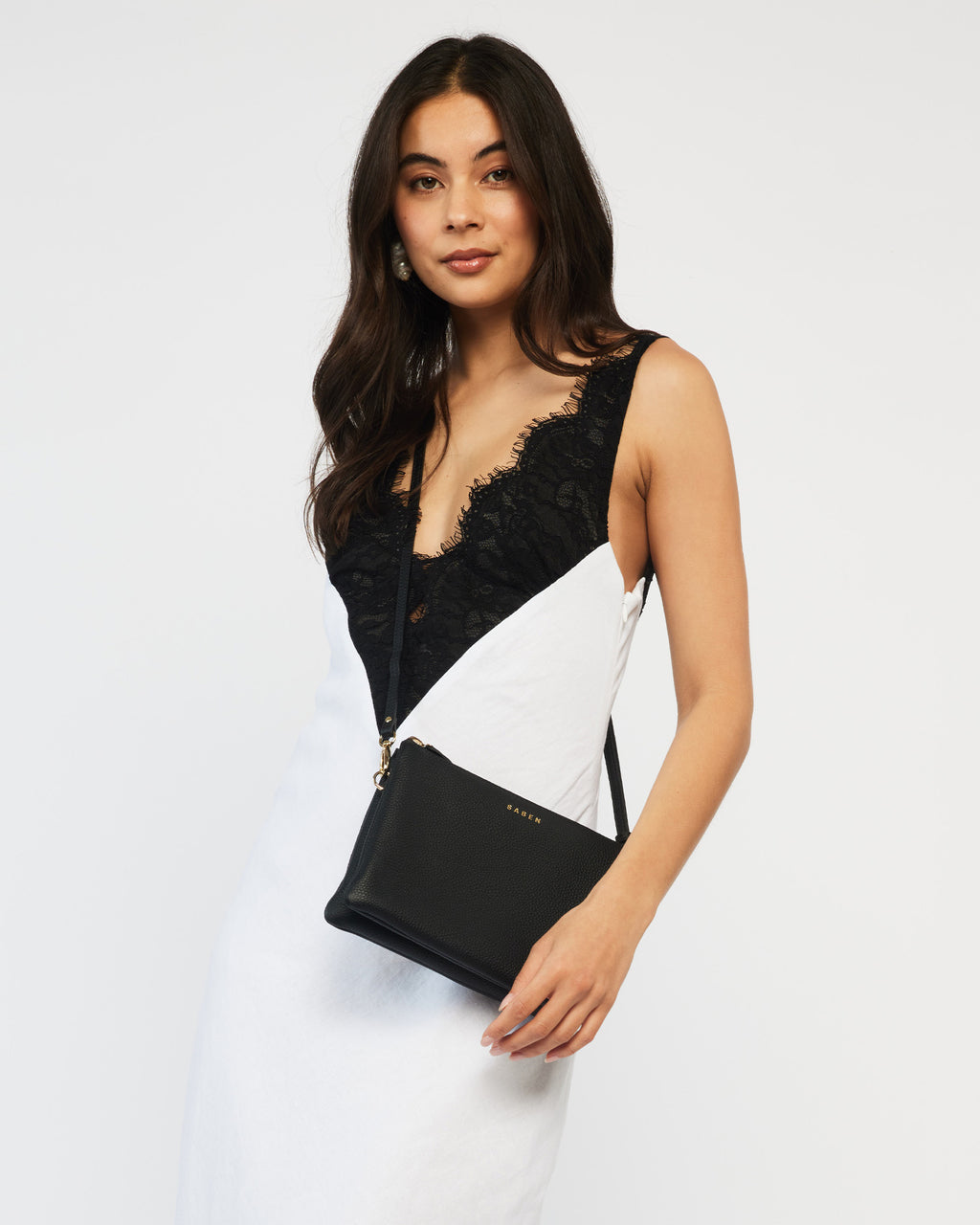Details: Detachable and adjustable long leather strap to be worn over the shoulder or across the body; six drop card slots; gold plated hardware; interior secure zip pocket; outer zip fastening.