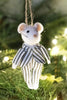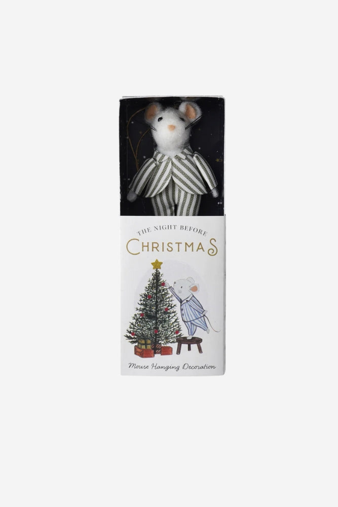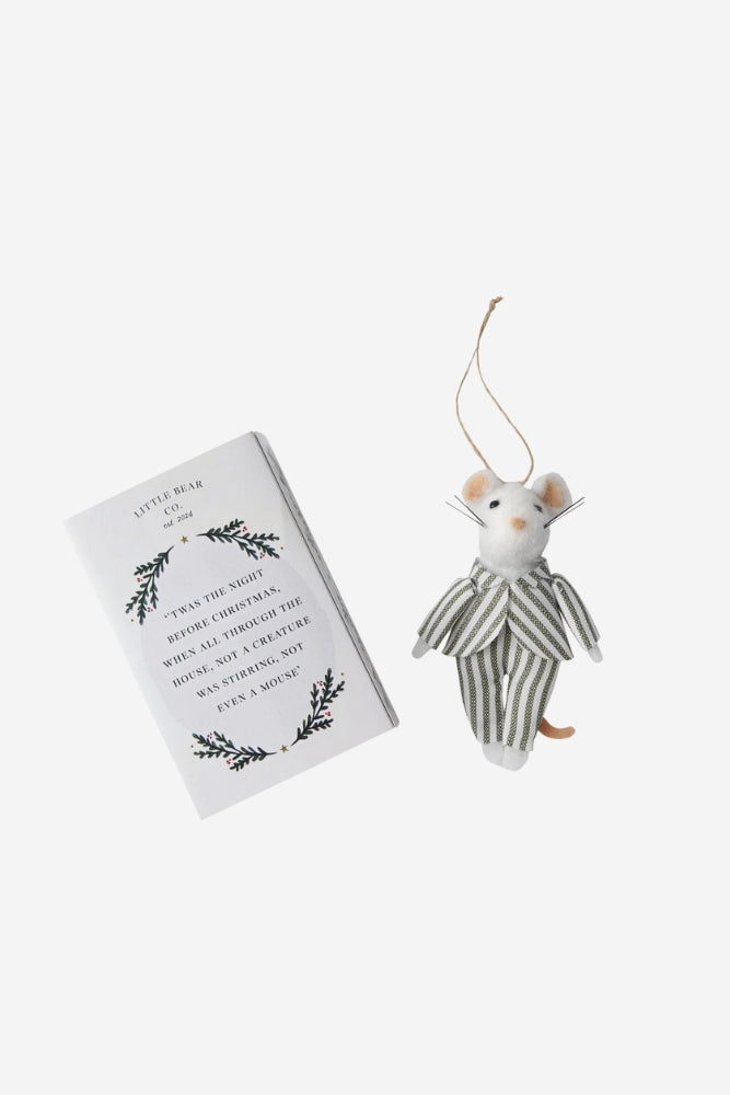 A white needle-felted mouse hanging decoration. Wearing sweet green and white striped pyjamas